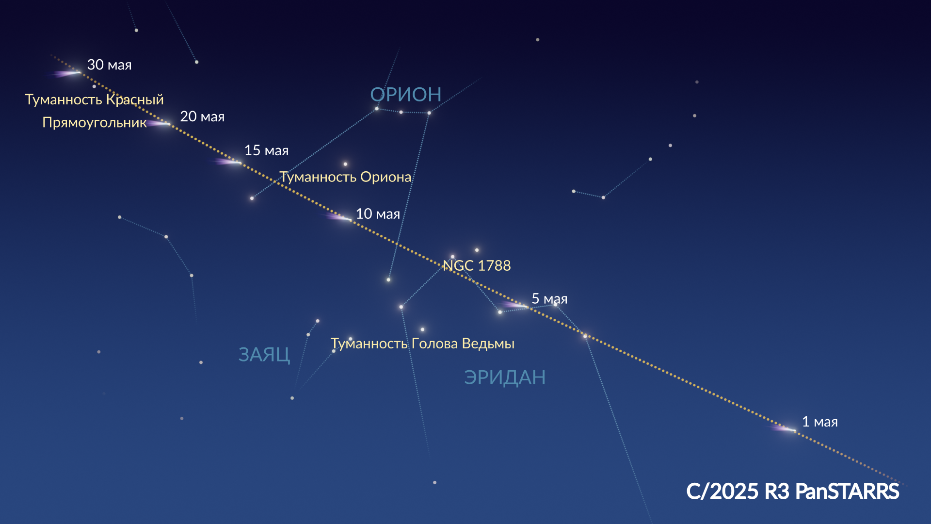 - С 10 по 12 мая комета C/2025 R3 видна в пределах примерно 2° от туманности Ориона.