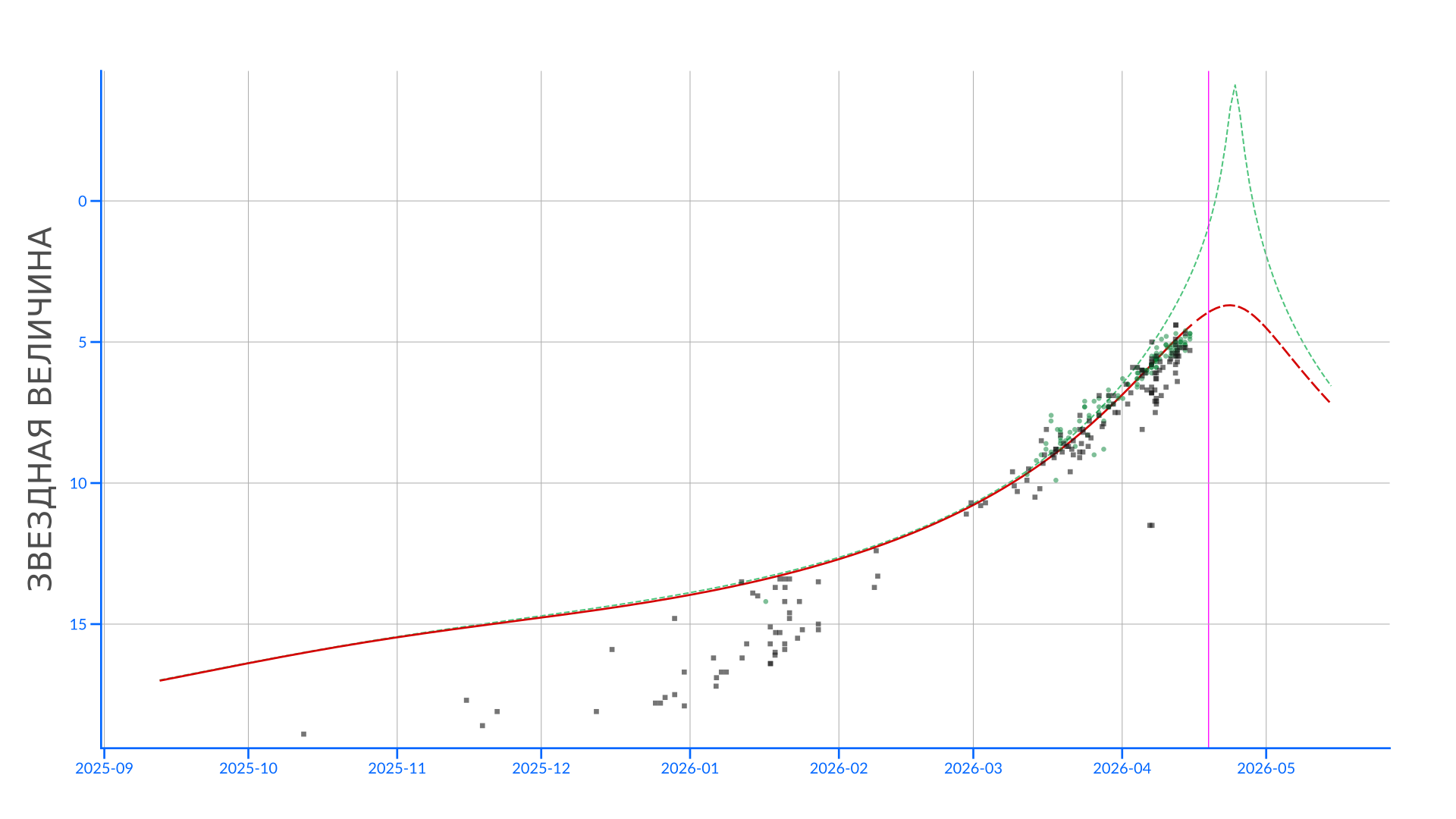 - Перигелий: 20 апреля 2026 года, 00:28 МСК (~0.49 а.е.)