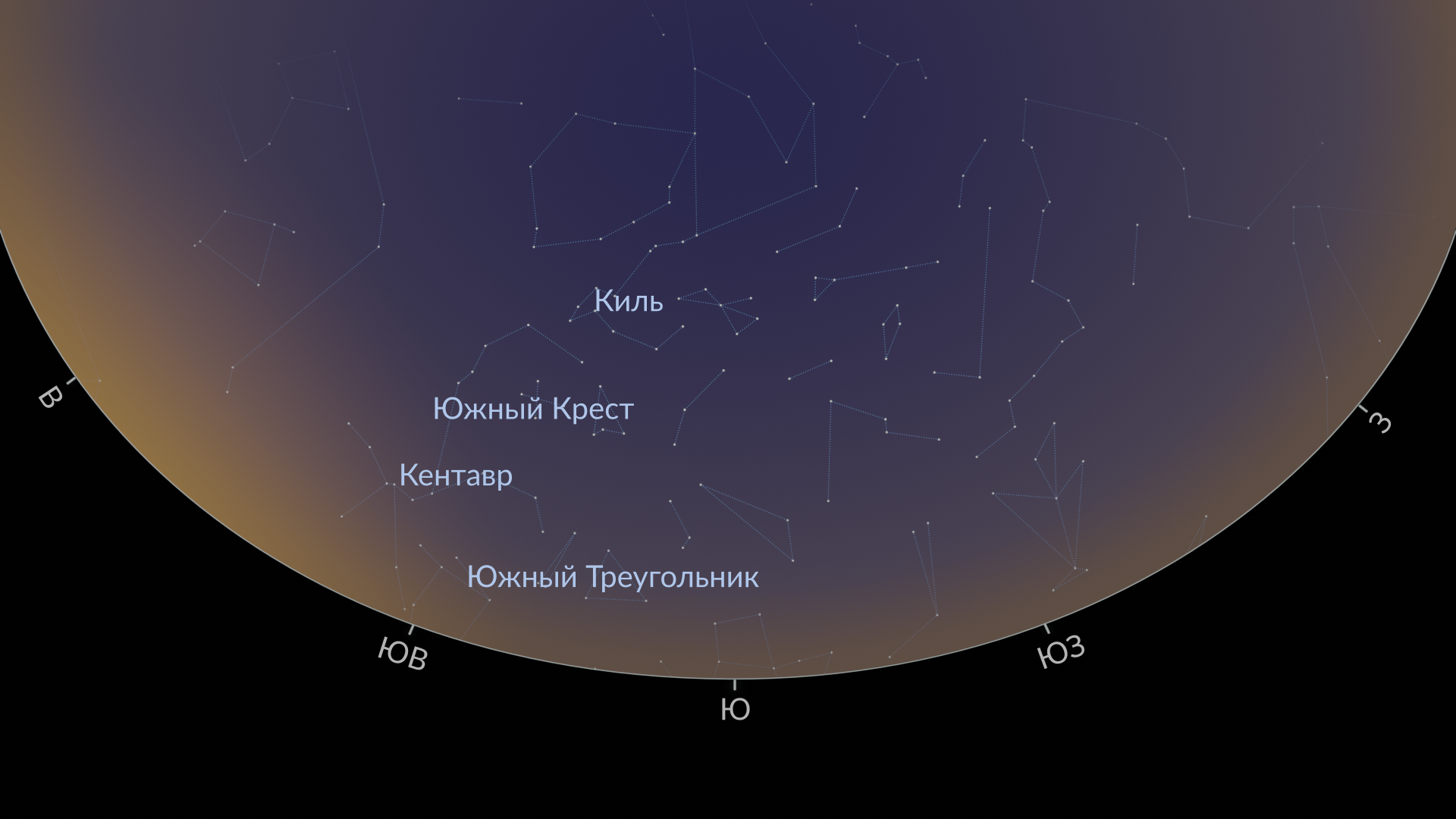 В Южном полушарии к приполярным созвездиям относятся Киль, Южный Крест, Кентавр и Южный Треугольник.