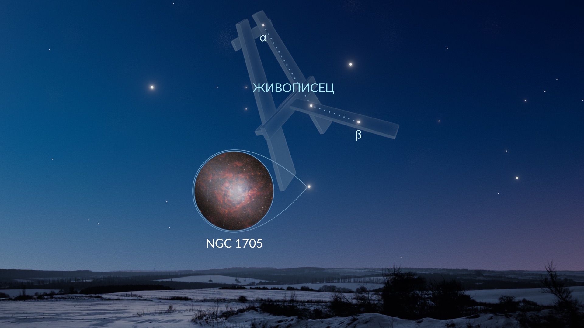- Заметный объект глубокого космоса: Карликовая галактика NGC 1705 (зв. вел. 12,5)