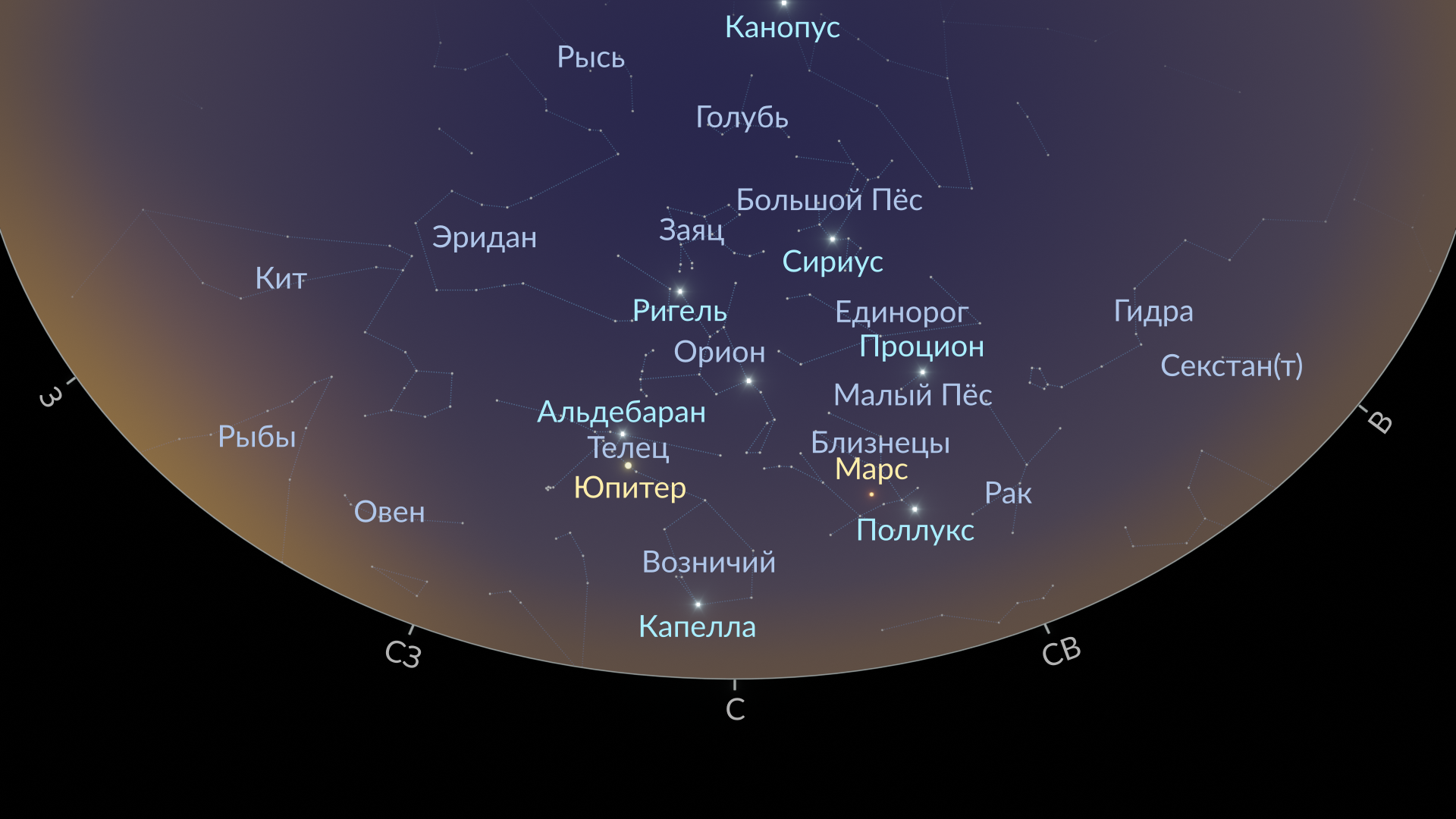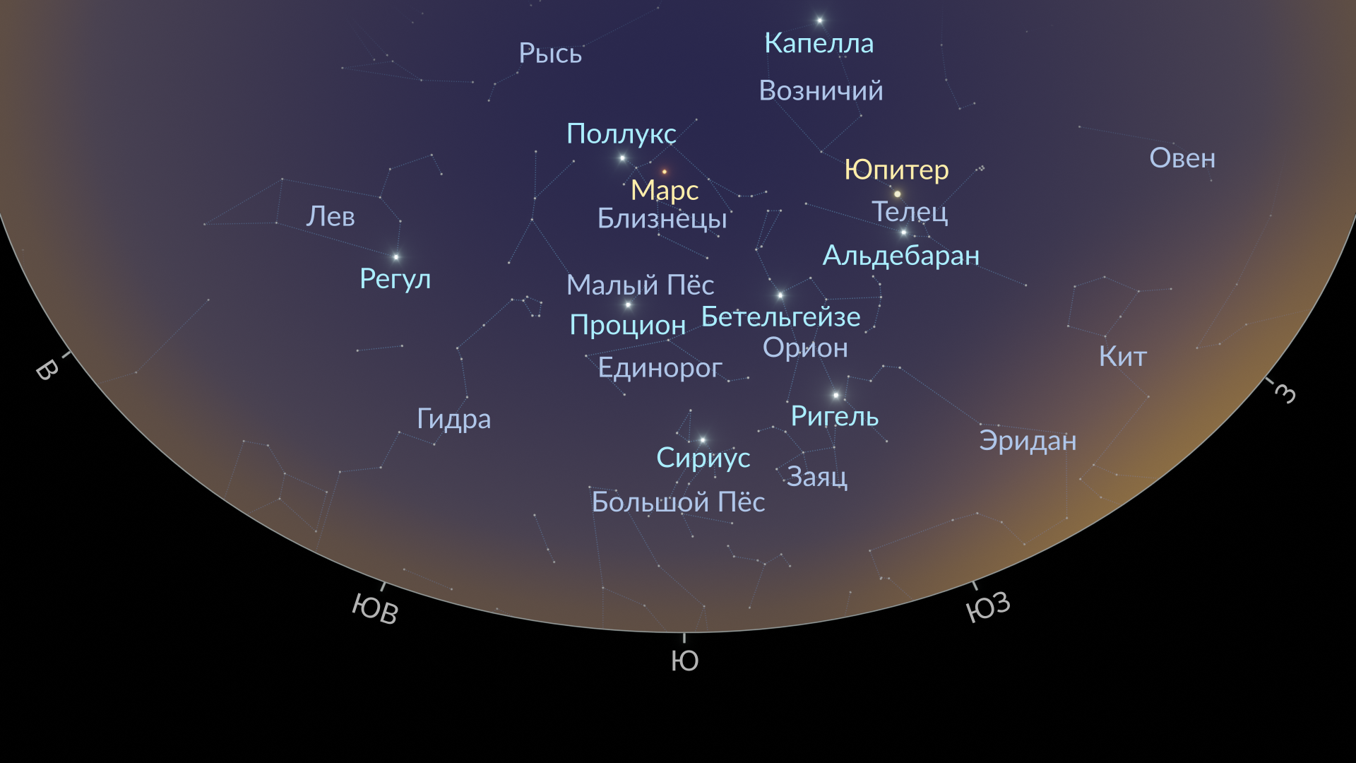 В феврале вы можете наблюдать такие созвездия, как Большой Пес, Близнецы, Возничий и многие другие. С бесплатным приложением Star Walk 2 найти их можно всего за несколько секунд — просто наведите ваше устройство на небо. В этой статье вы узнаете, какие созвездия лучше всего видны в феврале, когда их наблюдать и чем каждое из них примечательно.
