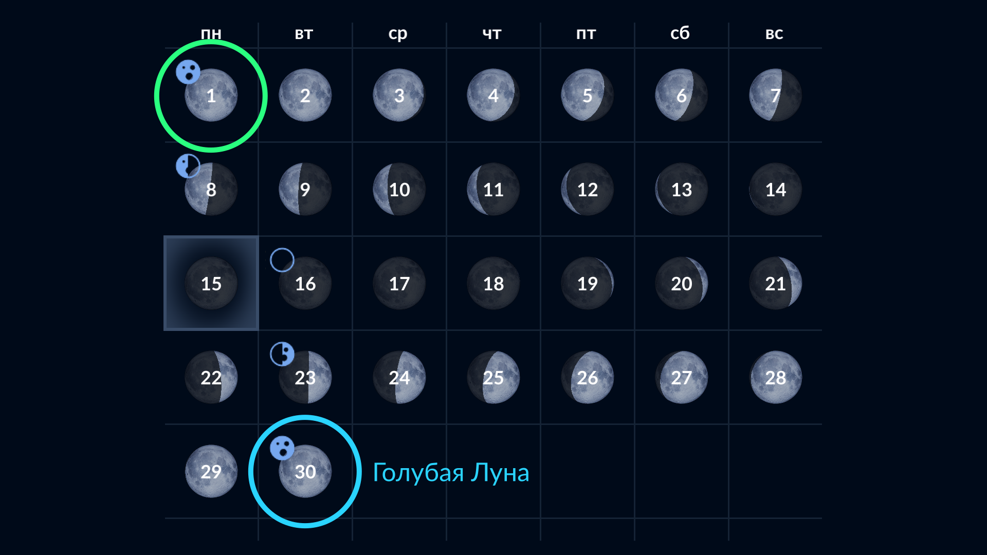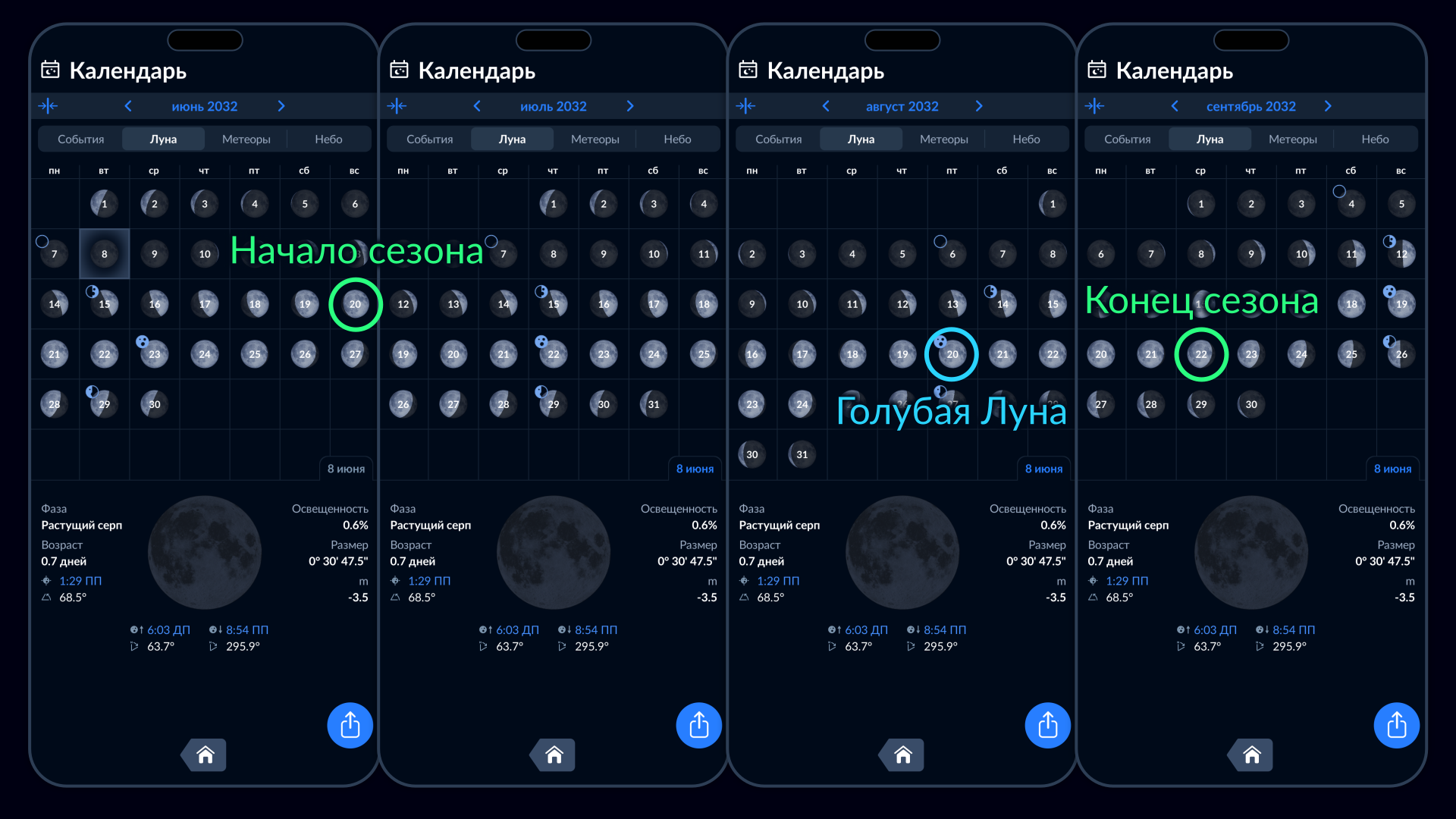 - Сезонная Голубая Луна: 21 августа 2032 года, 04:46 МСК (01:46 GMT)