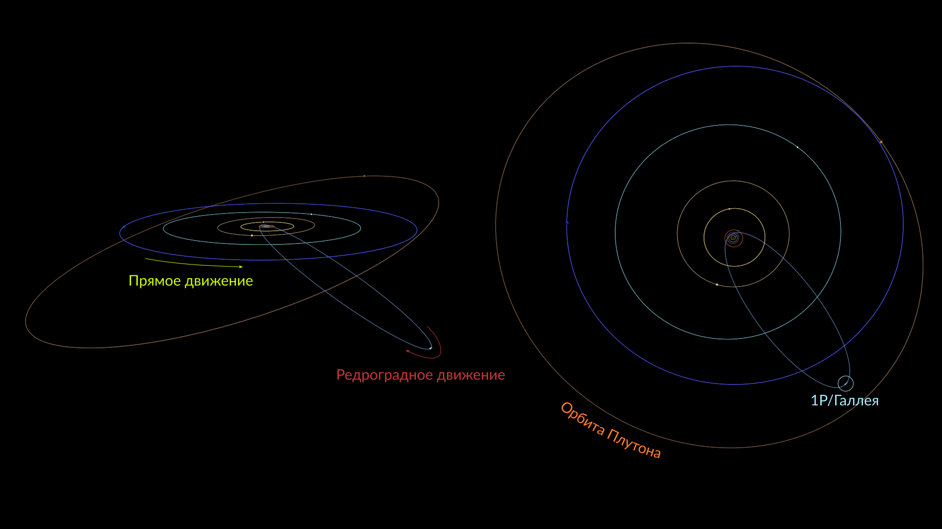 Комета Галлея — своего рода бунтарь в Солнечной системе. Она обладает ретроградной орбитой, то есть движется в противоположном направлении относительно большинства тел Солнечной системы, с наклоном в 18 градусов к эклиптике. Она также демонстрирует впечатляющую скорость — во время ближайшего прохождения к Земле в 1910 году она достигла 70,56 км/с. При этом в самой удаленной точке от Солнца она замедляется до 1 км/с. Впрочем, это нормальная ситуация: согласно второму закону Кеплера, небесное тело движется быстрее всего, когда находится в перигелии, и медленнее всего — в афелии.