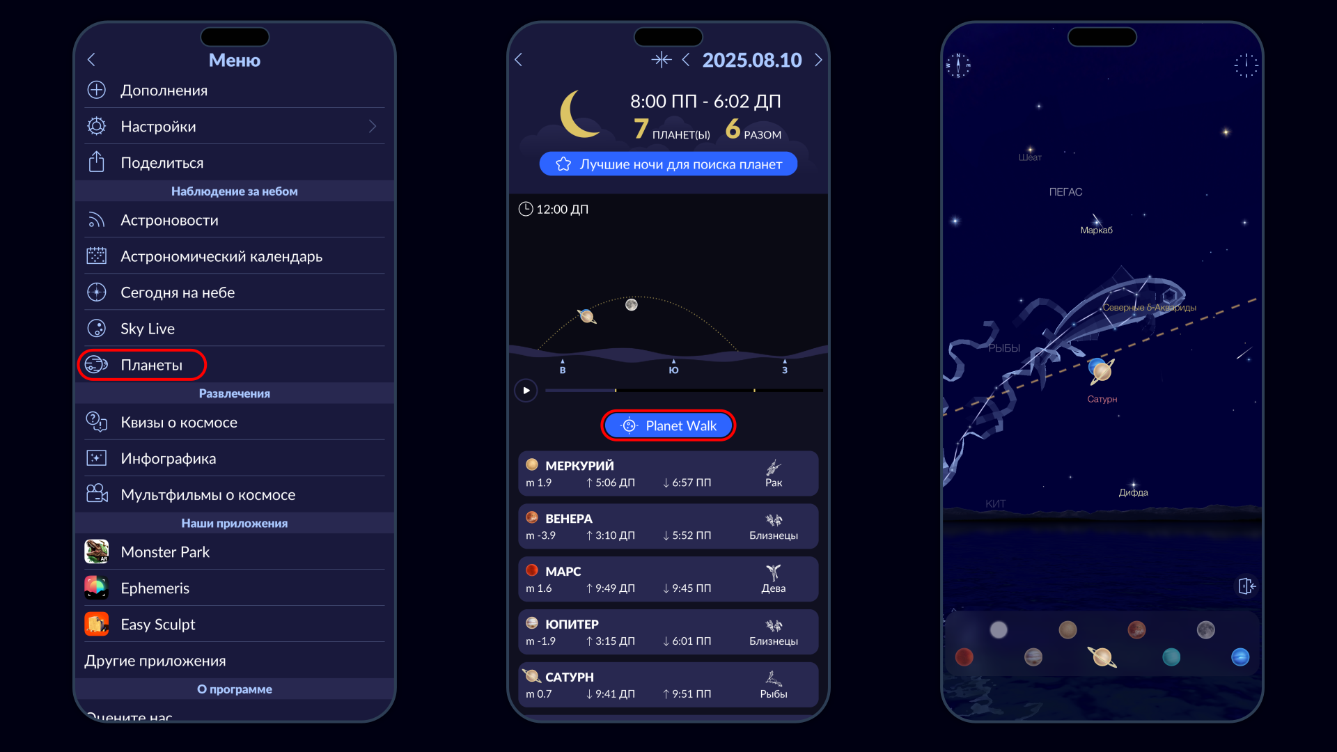 Чтобы убедиться, что вы точно смотрите на планету, используйте астрономическое приложение. Бесплатное приложение Star Walk 2 содержит удобный режим Planet Walk, в котором каждая планета выделена на карте неба, что упрощает поиск планет на фоне звезд. Просто откройте настройки, выберите пункт «Планеты» и нажмите Planet Walk. Вы увидите интерактивную карту с подсвеченными планетами и удобную нижнюю панель, позволяющую быстро перейти к любой планете.