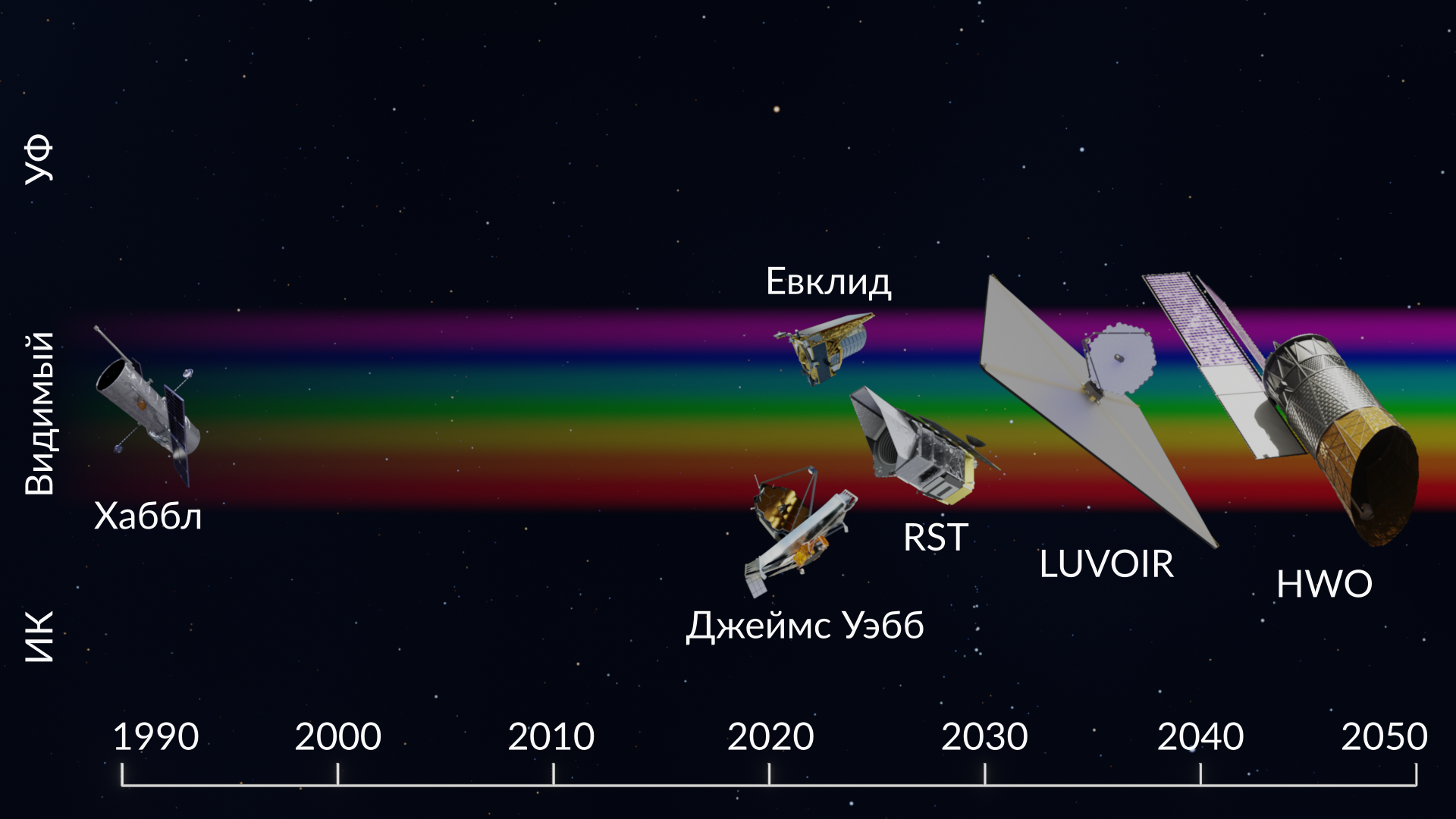 Обсерватория обитаемых миров (HWO): запуск запланирован на первую половину 2040-х. HWO задуман как флагманская миссия по поиску признаков жизни на экзопланетах земного типа.