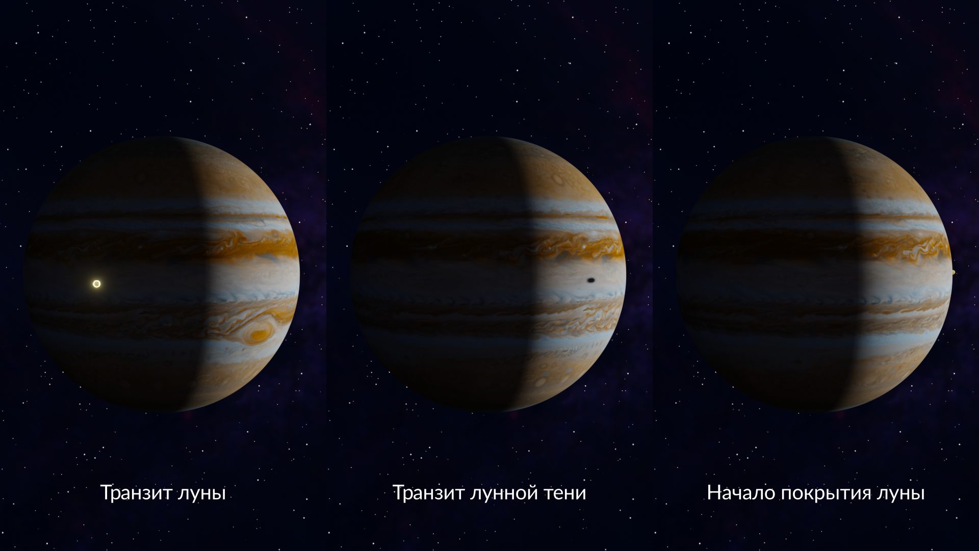 Спутники могут находиться не только рядом с Юпитером. В зависимости от их положения вы можете увидеть: