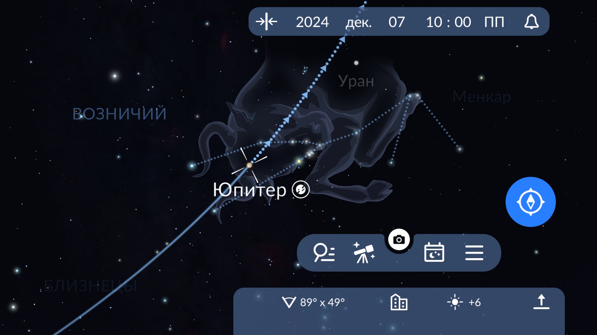 Чтобы быстро проверить, виден ли Юпитер сегодня ночью, нажмите на значок телескопа внизу экрана приложения и посмотрите, появляется ли Юпитер в списке доступных объектов.