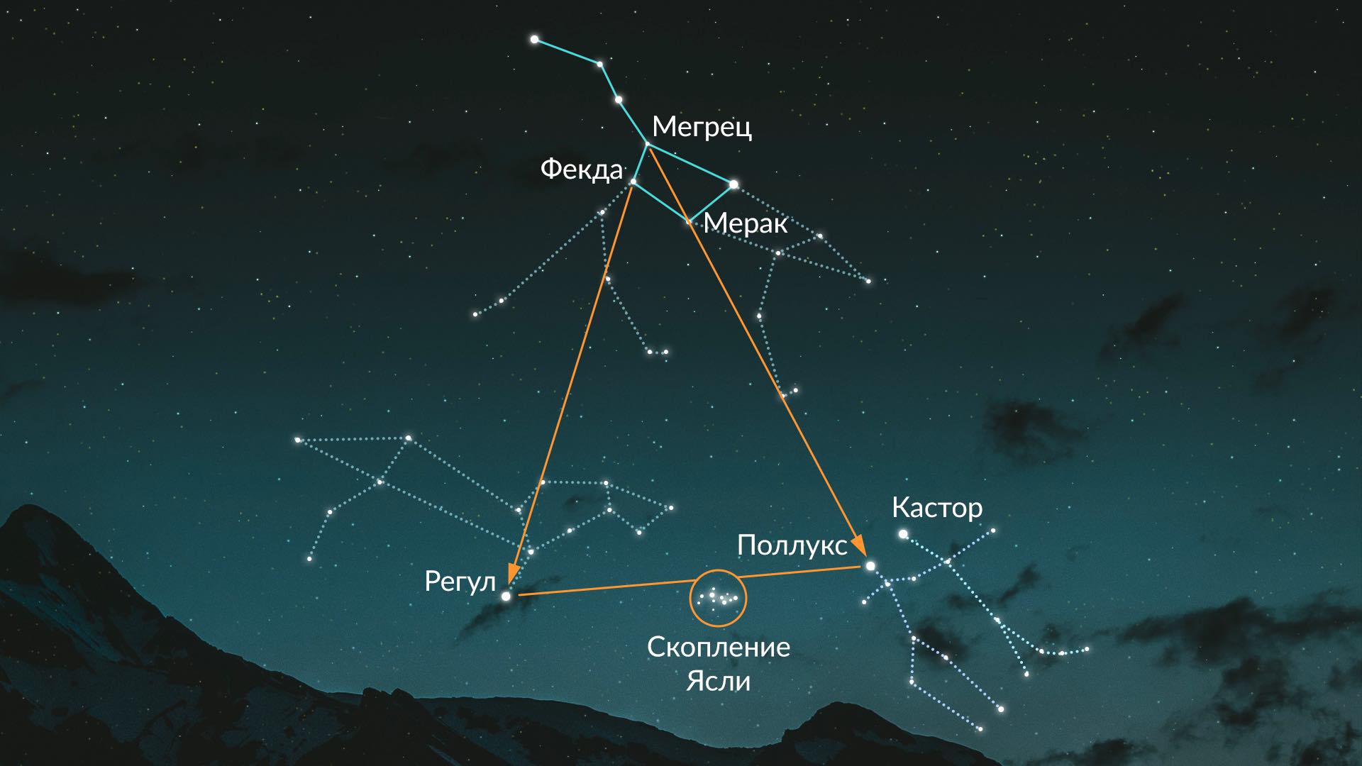 - Теперь соедините Регул с Поллуксом воображаемой линией. Примерно на полпути между этими звездами вы найдете скопление Ясли.