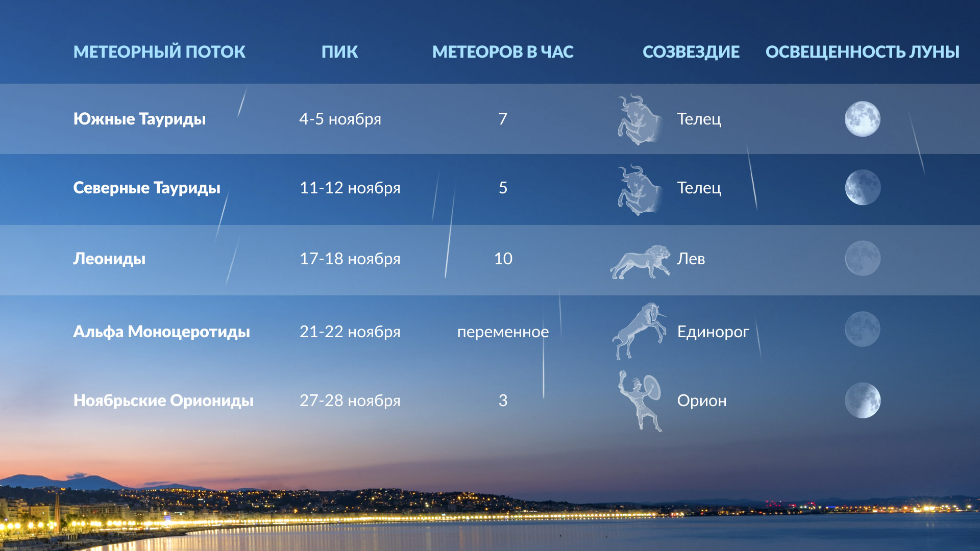 Пять метеорных потоков достигнут пика своей активности в этом месяце. Это Южные Тауриды, Северные Тауриды, Леониды, Альфа-Моноцеротиды и Ноябрьские Ориониды, среди которых самым обильным будет метеорный поток Леониды.