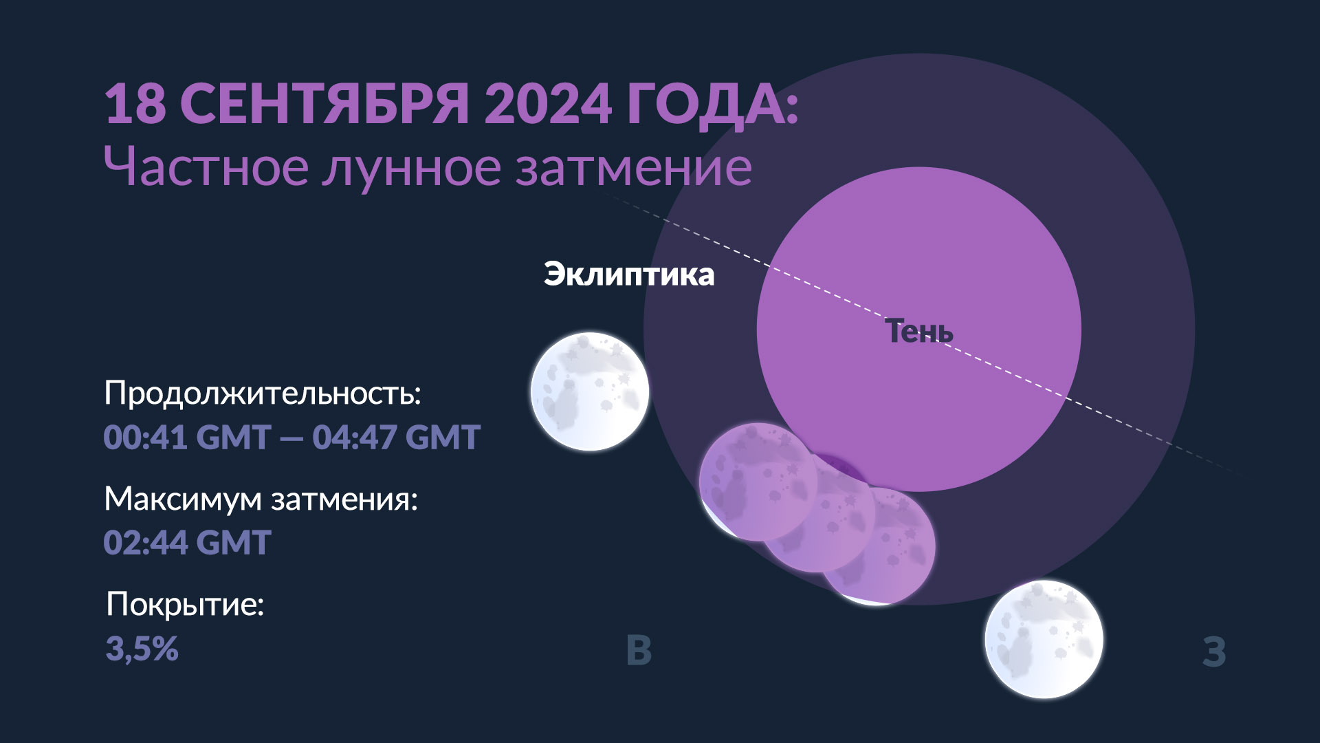 - Начало полутеневого затмения в 03:41 мск 18 сентября (00:41 GMT);