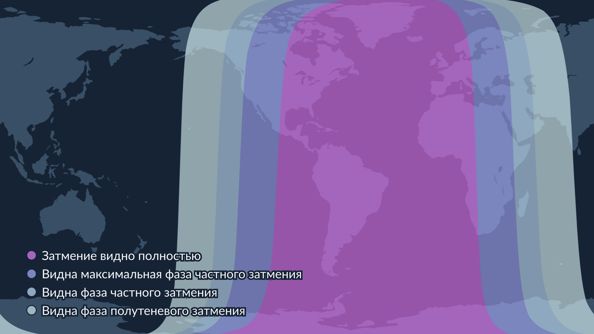Полностью затмение будет видно в западных регионах Африки и Европы, на юге и востоке Северной Америки, во всей Южной Америке и в некоторых частях Антарктиды.