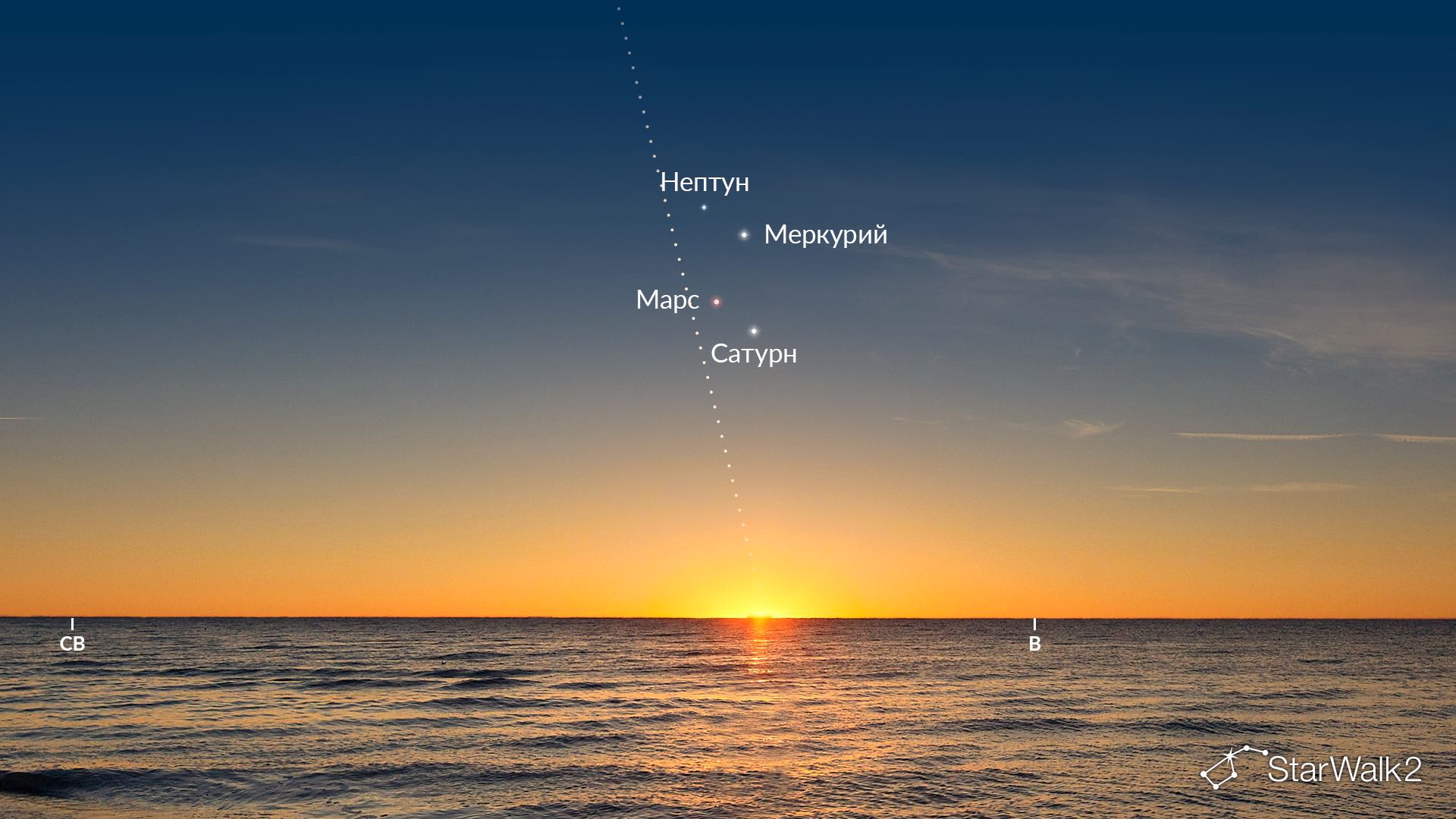 Парад планет в апреле 2026 года происходит близко к восходящему Солнцу. Отложите бинокль или телескоп как минимум за несколько минут до восхода Солнца — солнечный свет может неожиданно попасть в поле зрения вашей оптики и вызвать мгновенное необратимое повреждение глаз. Проверить точное время восхода Солнца для вашей локации можно в приложении Star Walk 2.