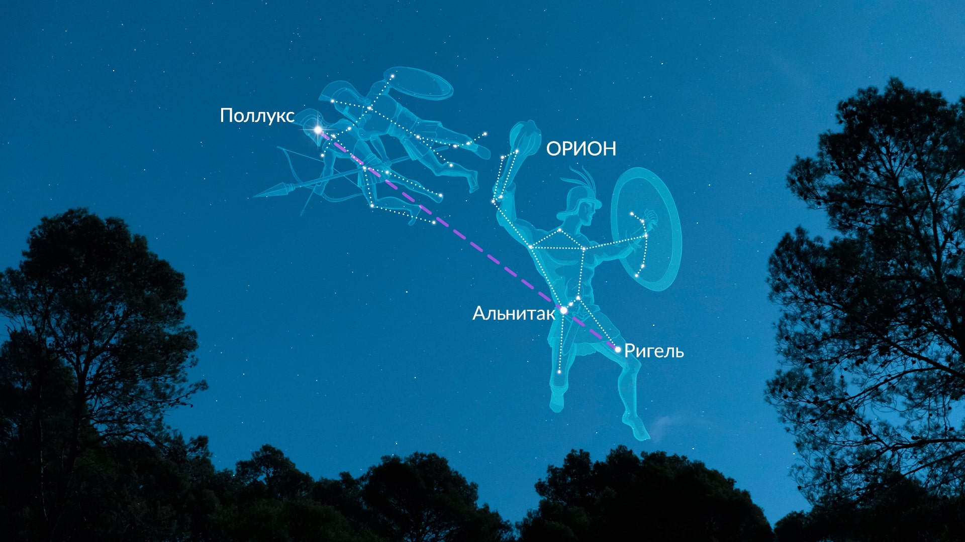 Другой способ найти Поллукс – использовать звезды Ориона в качестве ориентира. Все, что вам нужно сделать – это найти Ригель и Альнитак (яркие звезды в Орионе), провести через них линию и продлить ее на север.