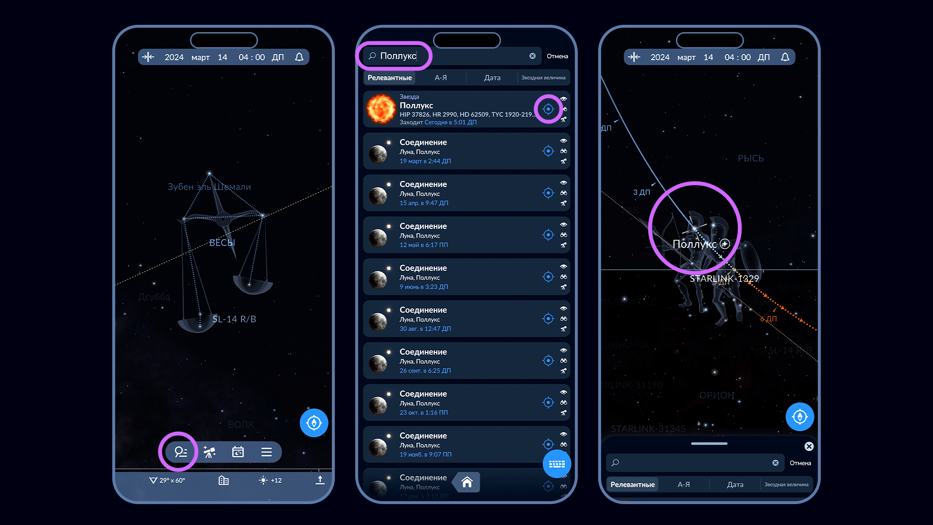 Еще один способ найти Поллукс – использовать приложение для наблюдения за звездами, например, Sky Tonight. С его помощью вы сможете определить местоположение любой звезды всего в несколько нажатий. Посмотрите на изображение ниже или посмотрите видеоинструкцию и убедитесь сами, насколько это просто!