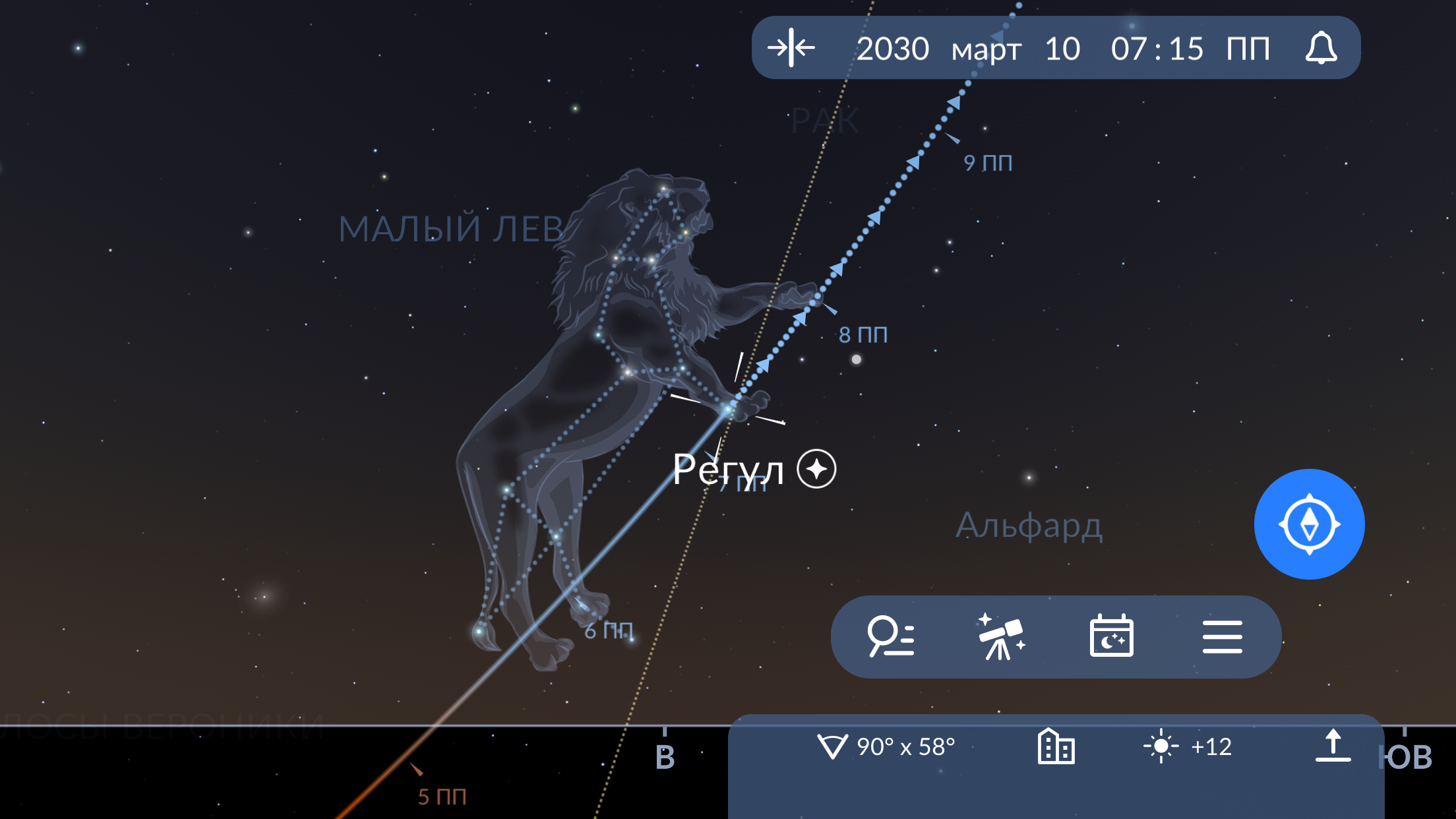 Исследование ночного неба – увлекательное занятие, и оно может быть очень простым, если иметь при себе подходящее астрономическое приложение, например Sky Tonight. С помощью этого бесплатного приложения вы сможете найти Регул за несколько простых шагов: