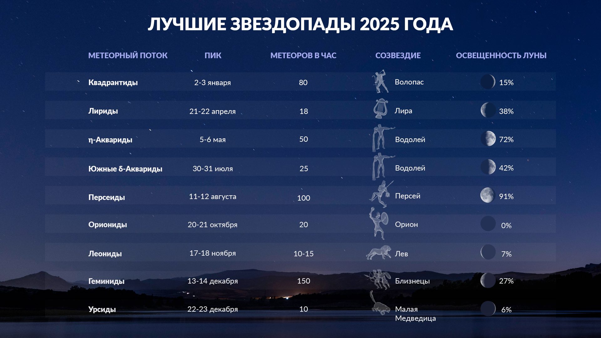 Ниже мы приводим список главных метеорных потоков 2025 года и даты их пика. Все перечисленные метеорные потоки происходят ежегодно примерно в одно и то же время. Чтобы узнать больше о каждом из потоков, кликните по ссылкам.