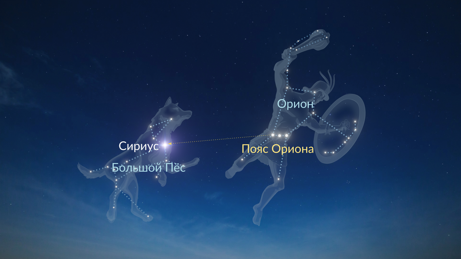 На самом деле Сириус – это не одиночная звезда, а система из двух звезд: Сириус A (звезда главной последовательности, A0) и Сириус B (белый карлик, DA2). На небе она переливается голубым, белым и красным. Этот эффект вызван преломлением звездного света в атмосфере Земли: белый свет от Сириуса расщепляется, проходя через турбулентные потоки воздуха, и до нашего глаза доходят разные цвета (волны разной длины). Вместе с Проционом из Малого Пса и Бетельгейзе из Ориона Сириус образует астеризм, известный как Зимний Треугольник. Он также обозначает один из углов Зимнего шестиугольника.