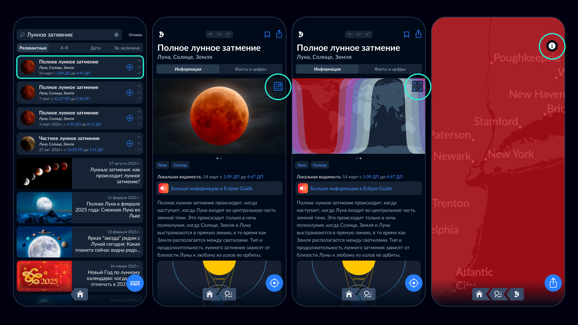 Хотите узнать, как затмение будет выглядеть именно в вашей локации? Используйте приложение Eclipse Guide! В нем вы найдете интерактивные карты, которые позволят вам заранее увидеть весь процесс затмения — от начала до конца — с правильной ориентацией Луны для вашего местоположения.