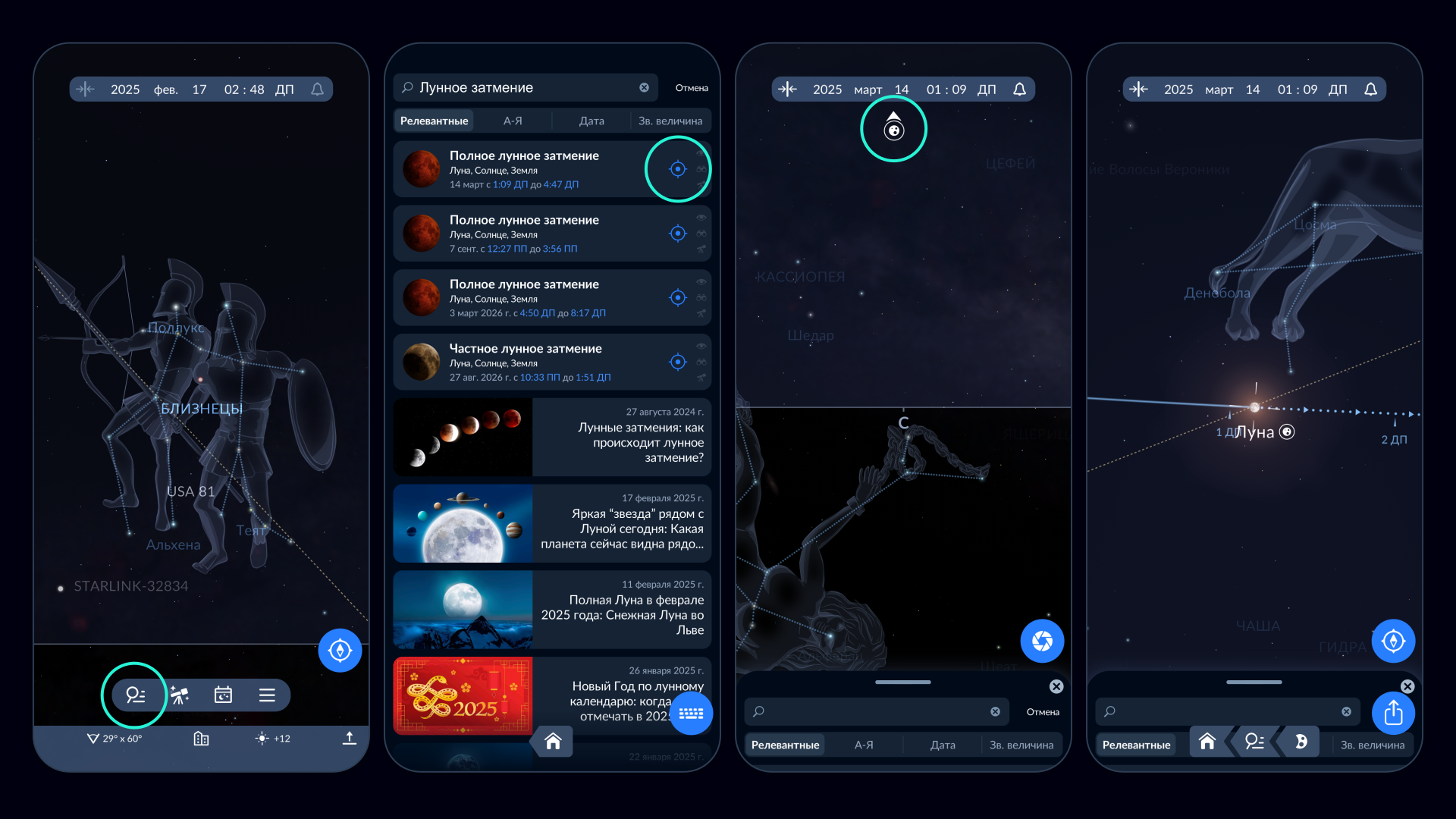 Чтобы увидеть, где на карте звездного неба будет находиться Луна во время затмения, нажмите на кнопку с прицелом. Чтобы совместить изображение на телефоне с реальным небом, нажмите на кнопку с компасом и следуйте за белой стрелкой, пока Луна не появится на экране. Запомните ее положение и заранее спланируйте ночь наблюдений!