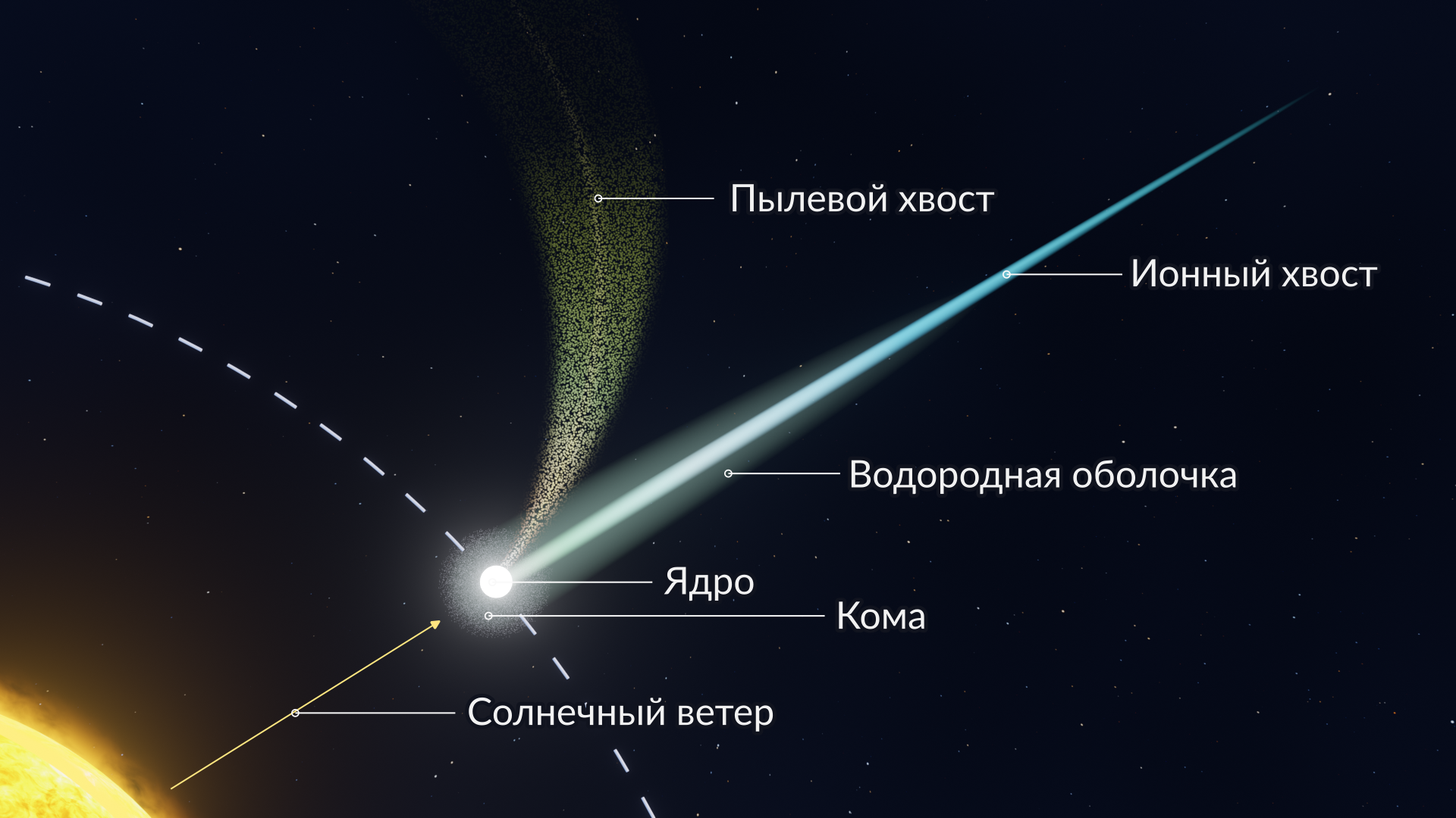 - Пылевой хвост состоит из мелких частиц пыли, которые отражают солнечный свет. Он широкий, часто слегка изогнутый и направлен от Солнца.