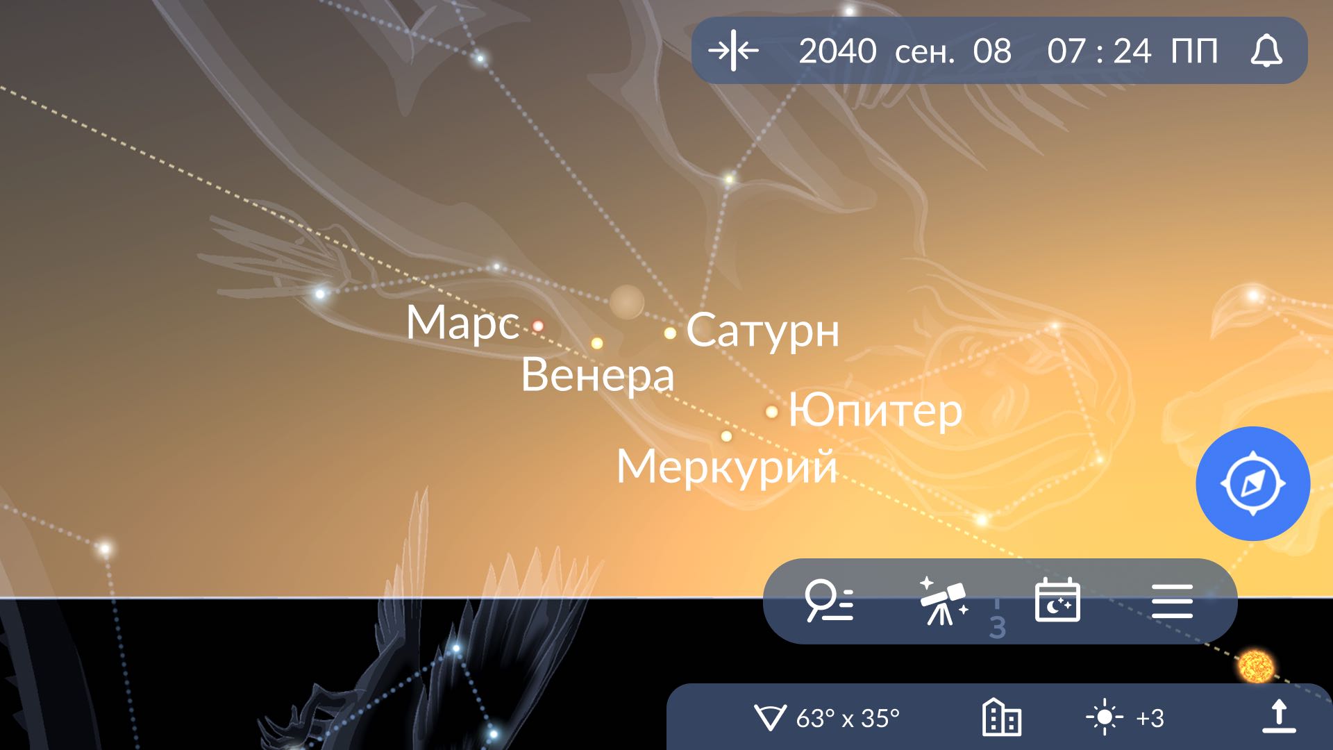Определить расположение планет так же просто с помощью приложения Star Walk 2. Для этого нажмите на значок компаса в правом верхнем углу экрана – приложение автоматически настроит изображение в соответствии с реальным небом над вами. Затем выполните шаги 2-4 из предыдущей инструкции и наслаждайтесь наблюдением планет.