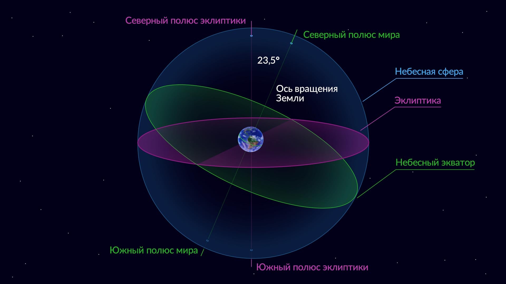 Наша планета не стоит вертикально на своей орбите: ось вращения Земли отклонена на 23,5 градуса от перпендикуляра, проведенного к плоскости орбиты Земли. Поскольку плоскость экватора Земли перпендикулярна оси вращения Земли, эта плоскость отклонена от плоскости эклиптики на такой же угол. Поэтому небесный экватор Земли наклонен под углом 23,5 градуса к эклиптике на небесной сфере. Из-за этого мы наблюдаем еще несколько небесных явлений.