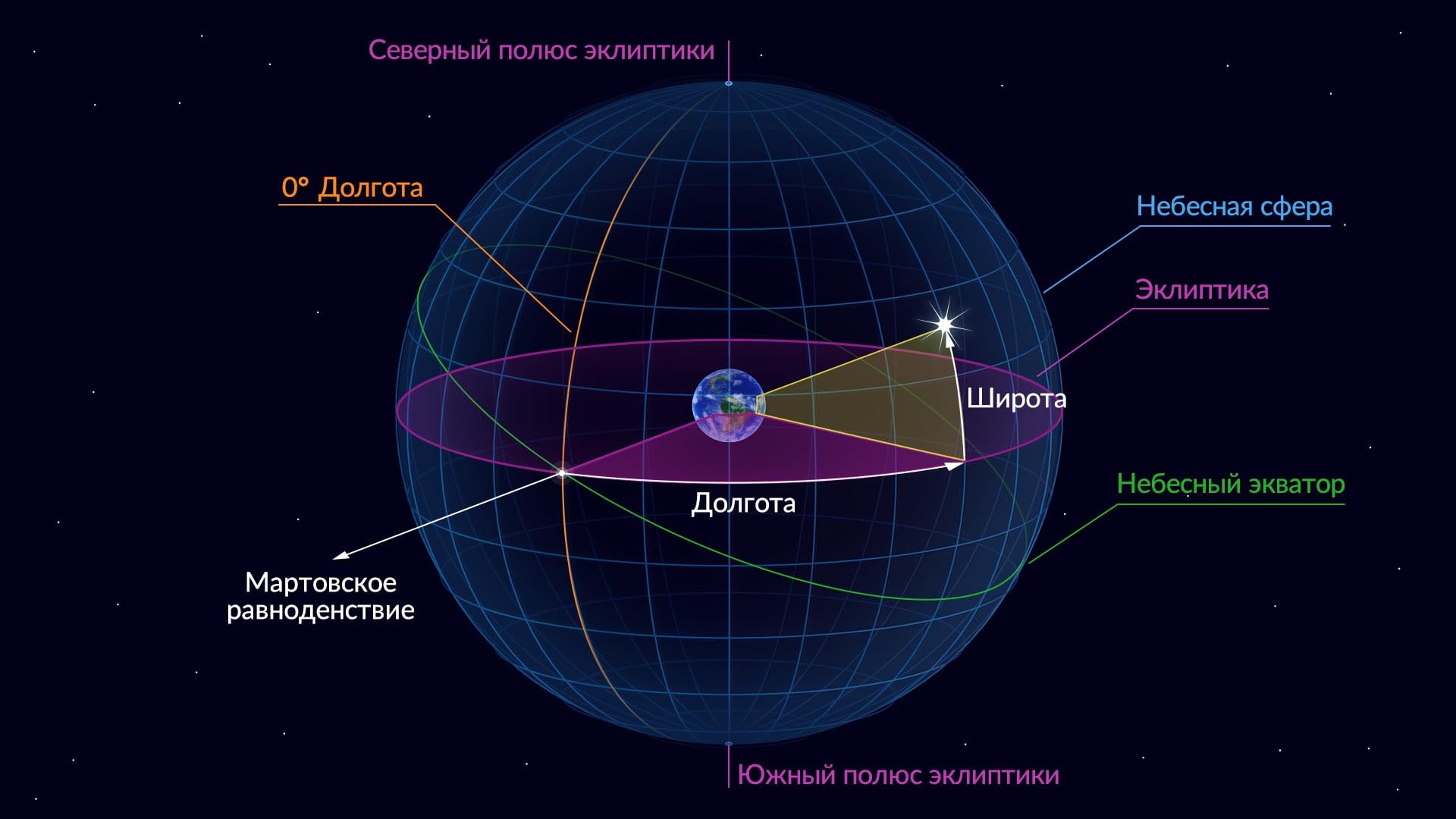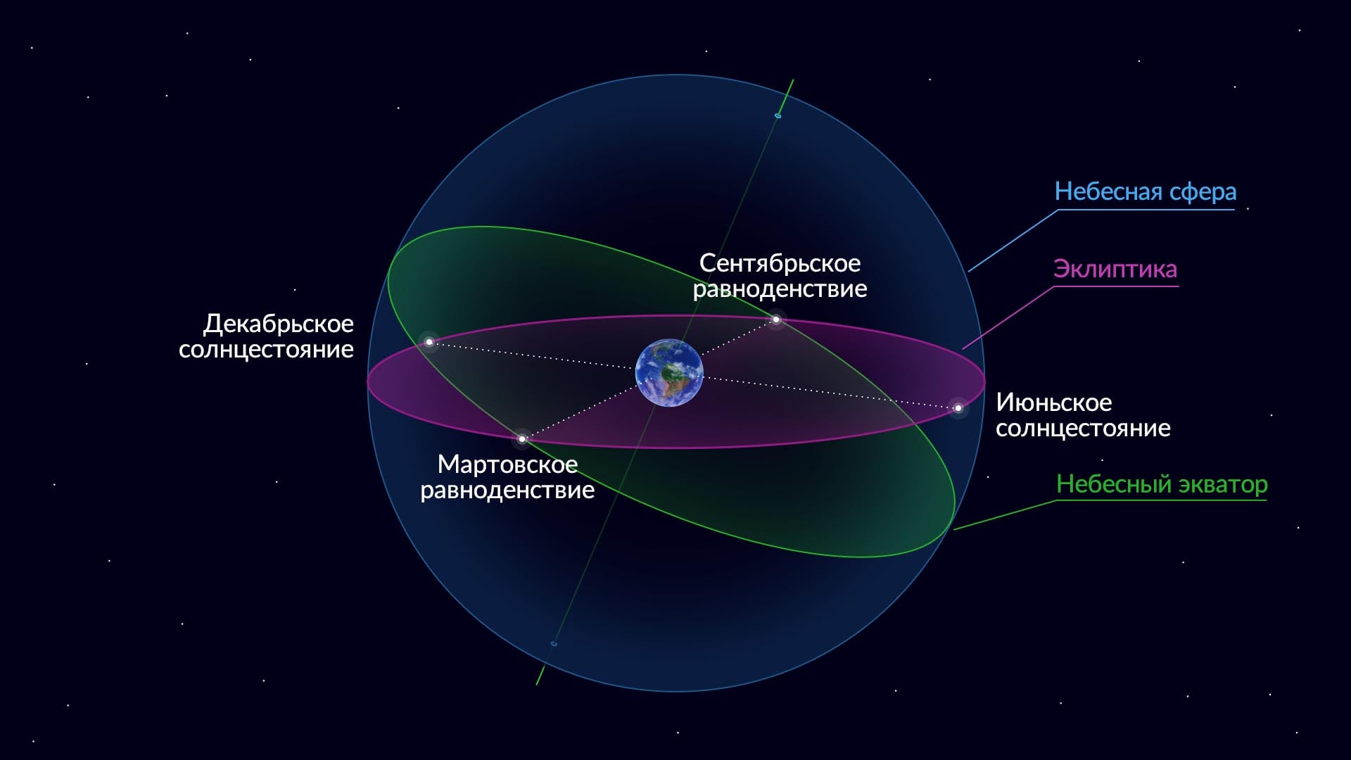 Небесный экватор и эклиптика пересекаются на небесной сфере в двух точках – эти точки известны как равноденствия. Они отмечают переход от астрономического лета к осени (осеннее равноденствие) и от зимы к весне (весеннее равноденствие).