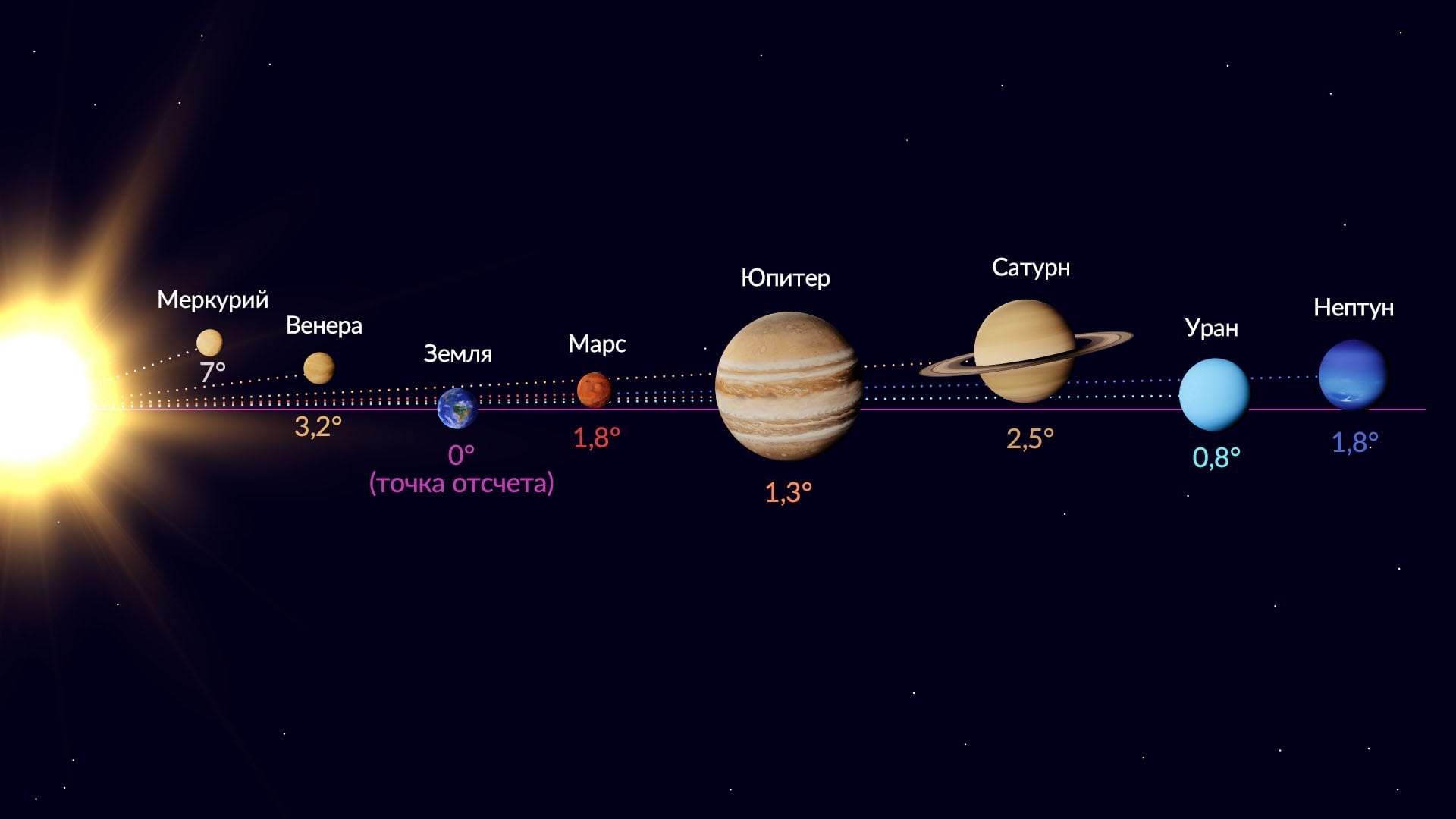 Орбиты всех планет Солнечной системы расположены близко к плоскости эклиптики, хотя их траектории слегка отклонены от неё. Орбиты планет отклоняются от плоскости эклиптики максимум на несколько градусов. Наибольшее отклонение – у Меркурия (7°); у других планет – от 0,8° до 3,2°.