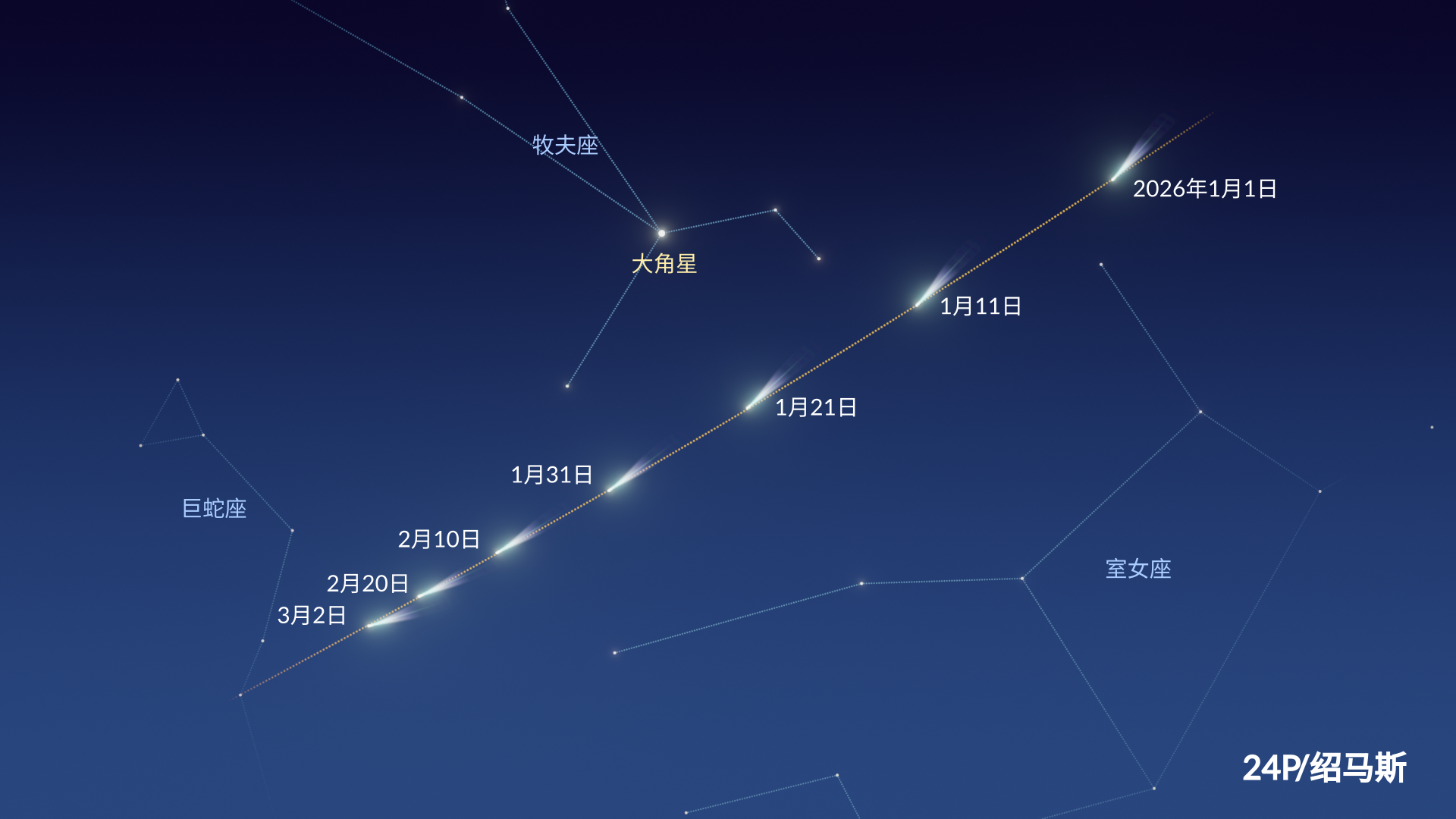 1月4日,24P/Schaumasse彗星将到达距离地球最近的位置。此时彗星预计亮度约为7.8等,在黑暗天空下可用望远镜或高倍率双筒望远镜观测。彗星在南北半球均可见,但在北半球的天空中位置更高。使用Sky Tonight应用可快速定位24P/Schaumasse彗星。