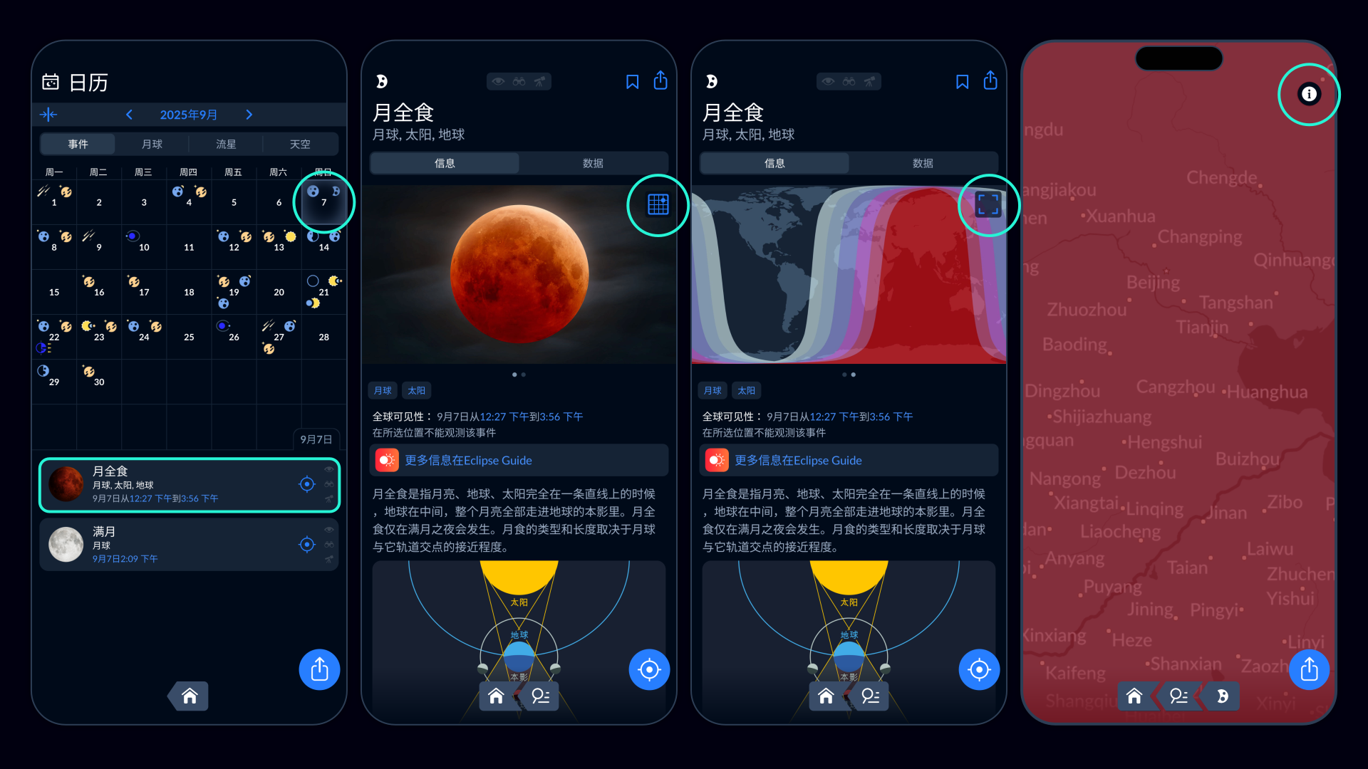 你可以提前查看2025年9月的月全食在你所在地的具体呈现效果。月食和日食已经被深入研究,科学家能够非常精准地计算和模拟它们。如今,许多应用程序和网站都能提供相关信息。