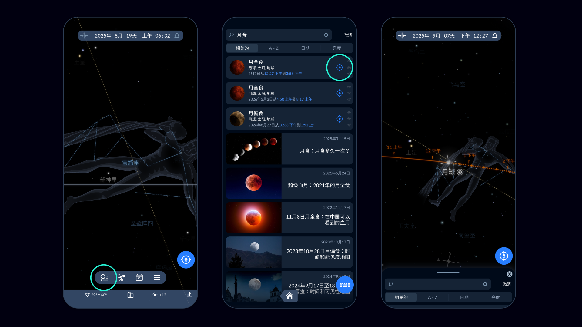 应用程序还会显示食甚时的月亮在天空中的位置: