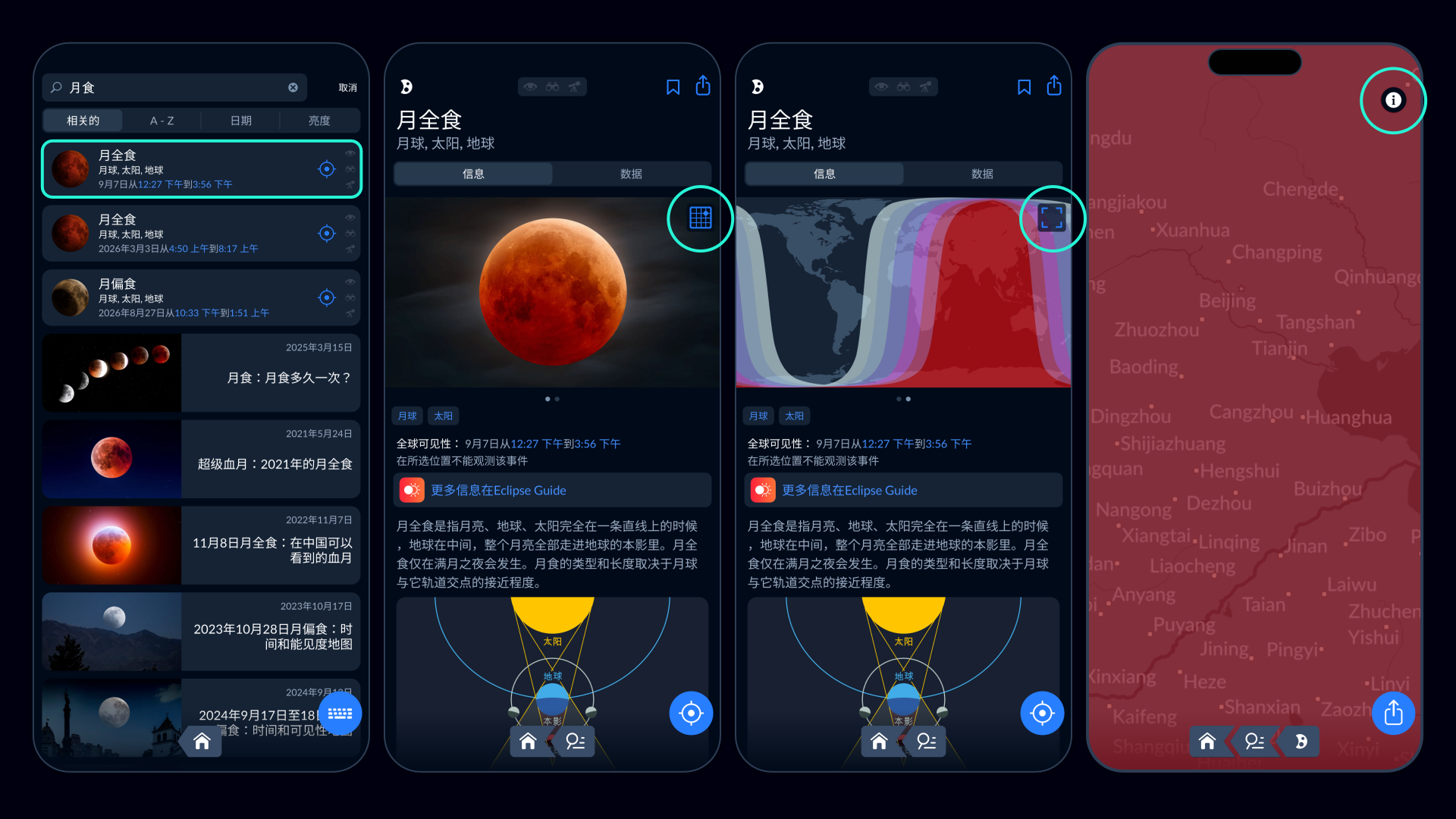其中一个例子是Eclipse Guide 应用。它的交互式地图展示了整个月食过程,并根据你的位置调整月亮的朝向。