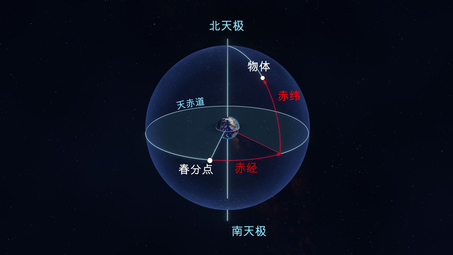 - 天赤道:地球赤道平面与天球相交的圆。就像地球赤道一样,它将天球分为北半球和南半球。
