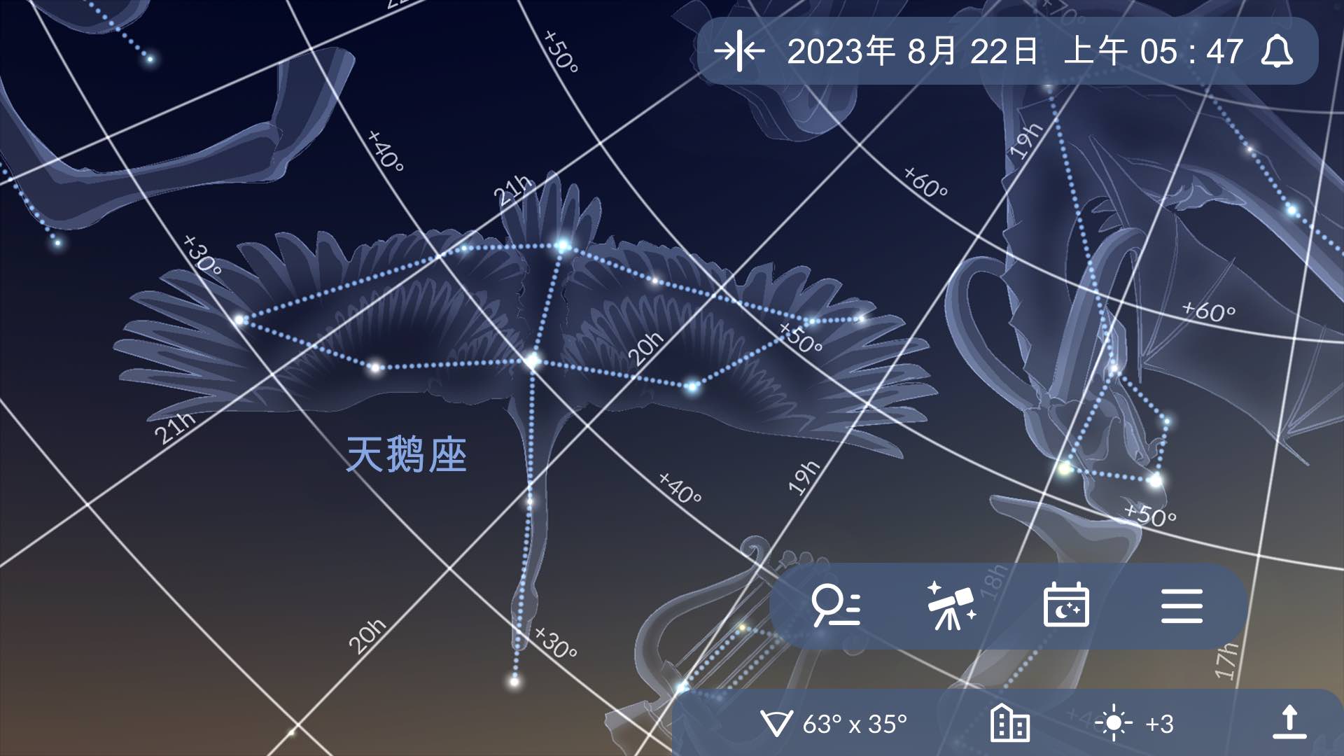 - 应用网格。在同一面板上,单击地球图标一次,将赤道网格覆盖在星图上。再次单击该图标以覆盖方位角网格。您应该选择的十字线类型取决于您的望远镜架台。