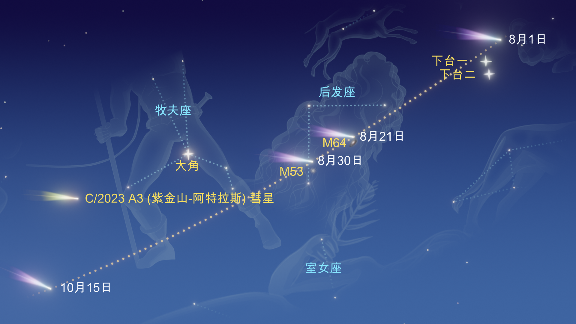 - *8月30日:星等~9.0,经过球状星团M53;