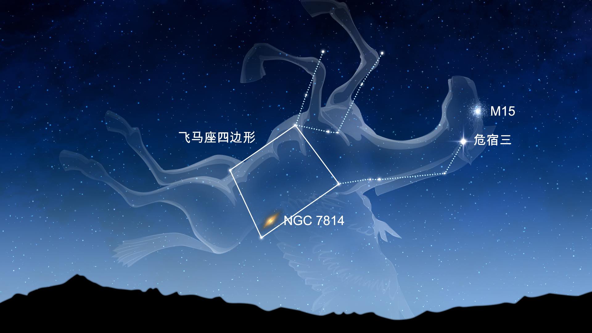 飞马座是最大的星座之一(在88个星座中排名第7)。它很容易通过飞马座四边形星群识别,其中只有三颗星(室宿一、室宿二、壁宿一)属于飞马座,而壁宿二属于仙女座。这些星星是肉眼可见的。星座中用双筒望远镜可见的最佳天体是M15,即飞马座大星团。