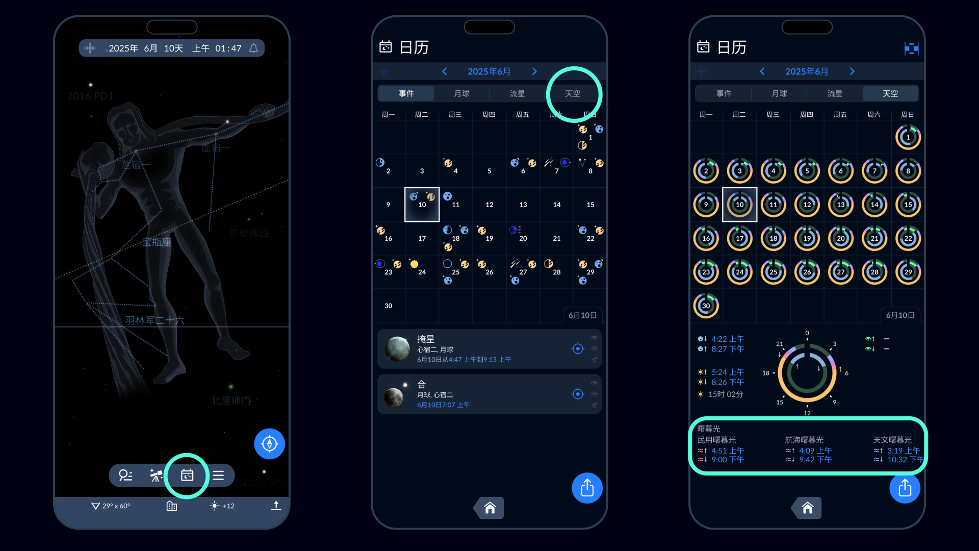 要了解你所在位置的完全黑暗时间,请使用Sky Tonight应用。 打开应用,点击屏幕底部的日历图标,然后选择“天空”选项卡。Sky Tonight将向你显示完全黑暗的开始和结束时间及其持续时间。