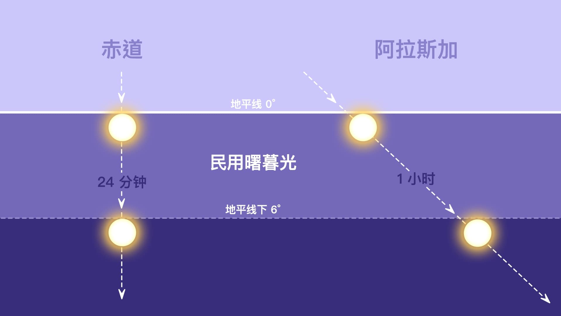 想象一下,曙暮光是太阳穿过靠近地平线的一条狭窄带状区域的时间,这条带约有18°宽,被划分为三个6°的区段。曙暮光的持续时间取决于太阳穿过这条带的速度。