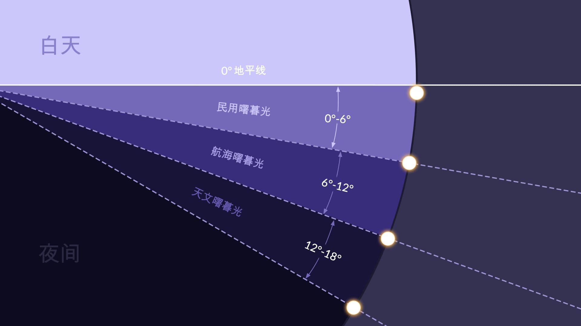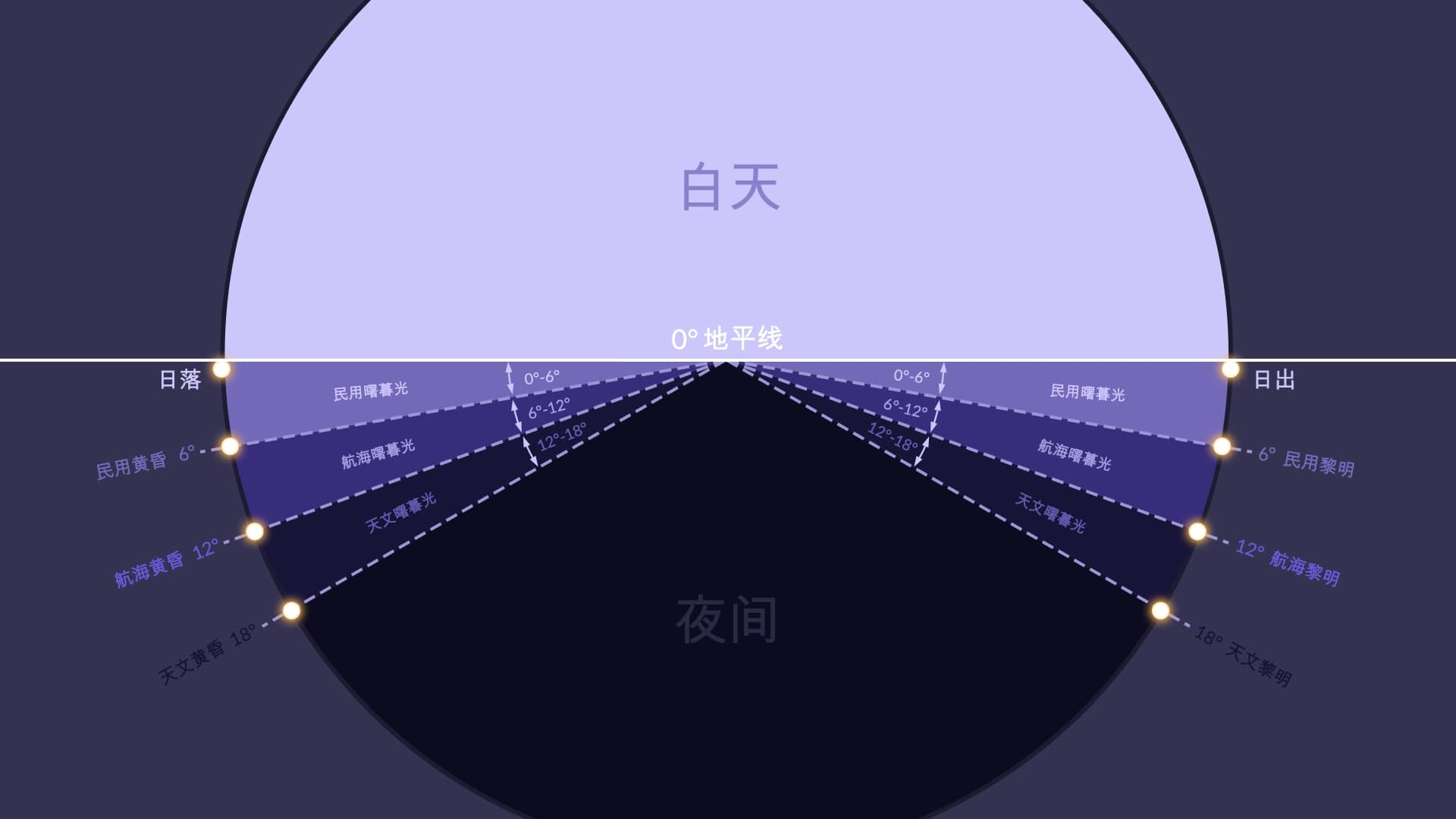 黄昏和黎明是特定的时间点,取决于太阳相对于地平线的位置。就像曙暮光一样,黄昏和黎明也有三种类型。每个阶段太阳的中心在地平线下的位置如下:
