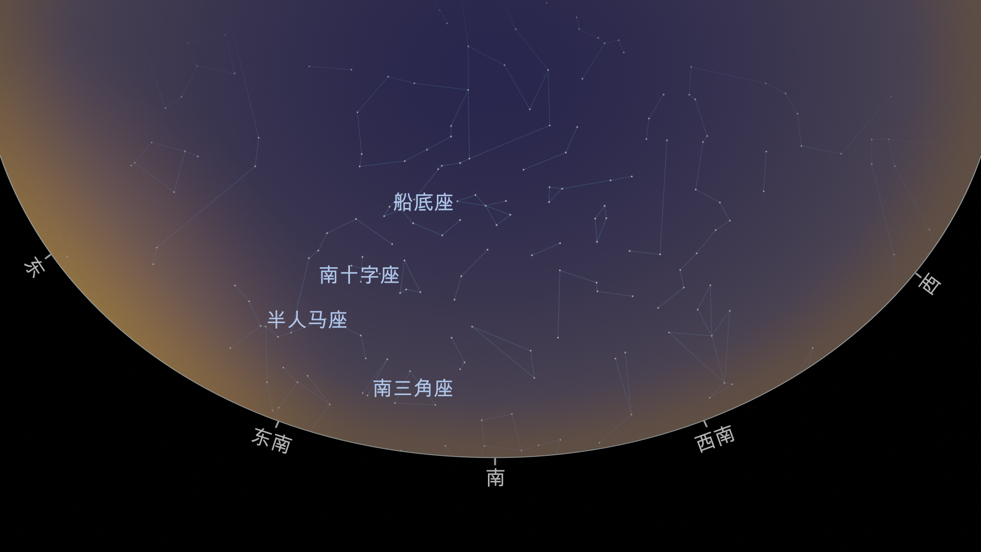 在南半球,拱极星座包括船底座、南十字座、半人马座和南三角座。