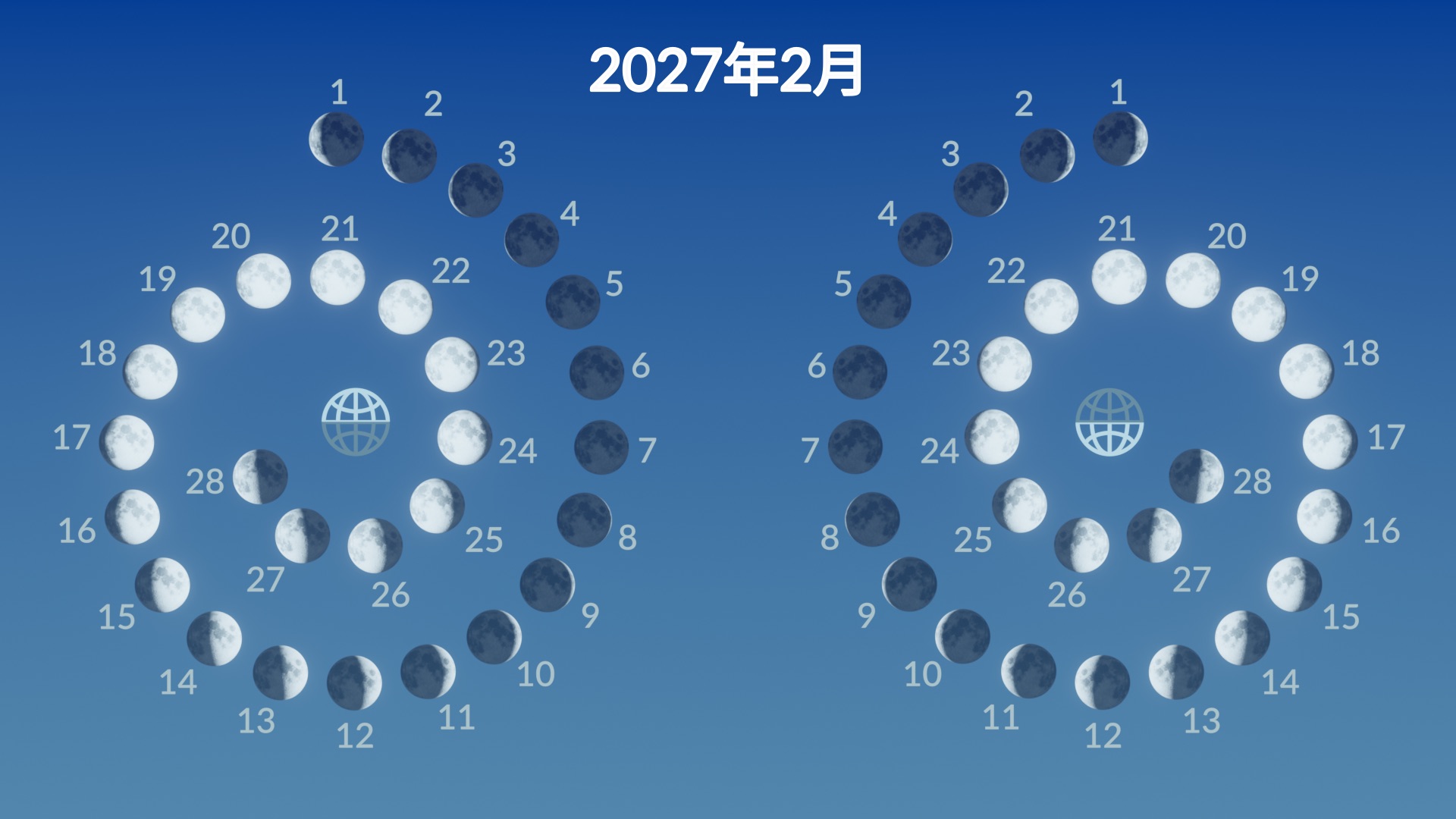 - 满月:2027年2月20日23:23 UTC(北京时间2月21日07:23,半影月食)