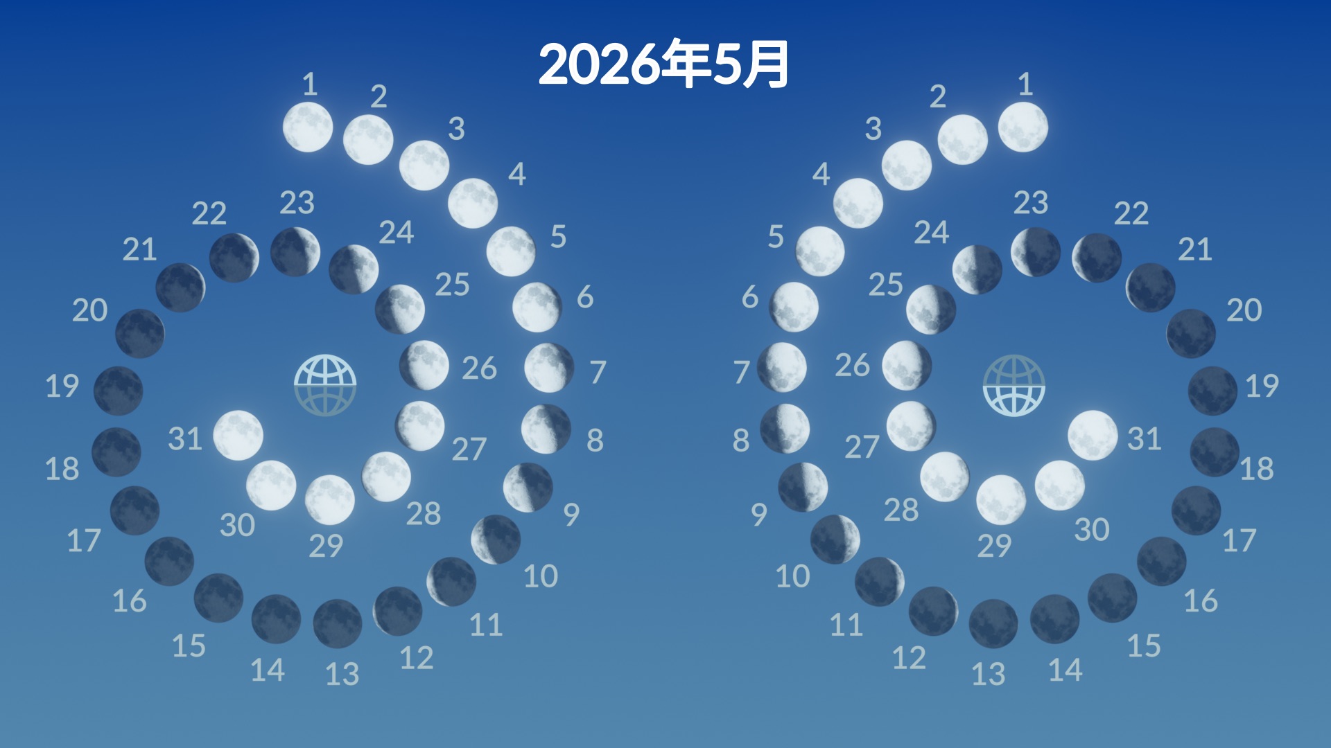 2026年5月有两次满月。第一次是传统上称为花月的满月,发生在5月1日17:23 UTC/GMT(北京时间5月2日01:23)。第二次满月将发生在5月31日08:45 UTC/GMT(北京时间5月31日16:45)。