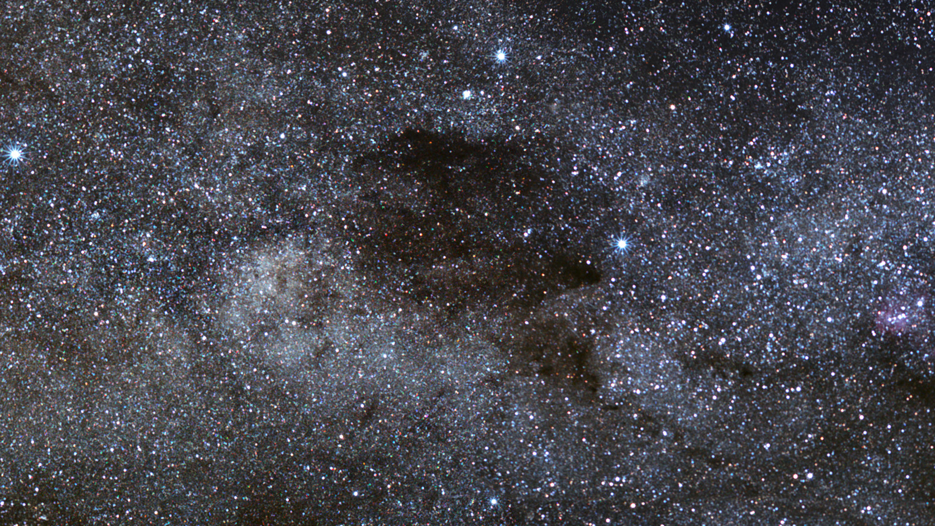 大多数星云都会发光,而煤袋星云却是一片黑暗的空洞,它切割了银河那条闪亮的星河。这片引人注目的黑暗区域横跨约5°×7°,位于南十字座,并延伸至半人马座和蝎虎座。它神秘的黑暗数世纪来一直令人为之着迷。印加人将它视为银河中被愤怒之神踢开的伤口;澳大利亚原住民传说则认为它是天鹅星云的头部——一只“银河鸸鹋”,身体沿着银河延伸。最棒的是,在南半球的晴朗夜空下,你可以肉眼直接看到煤袋星云。