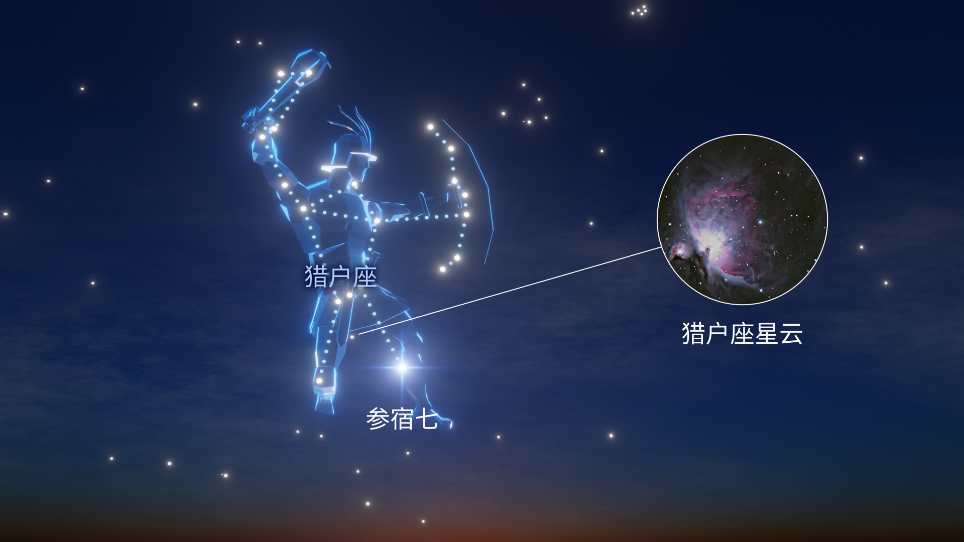 猎户座在1月主宰着夜空。夜幕降临后,你可以在南方地平线上方看到这个星座。构成猎户腰带的三颗恒星(参宿一、参宿二、参宿三)亮度相近,并几乎排成一条直线。在它们附近的是猎户之剑——其中间那颗“星”实际上是猎户座大星云,新恒星和行星正在那里诞生。