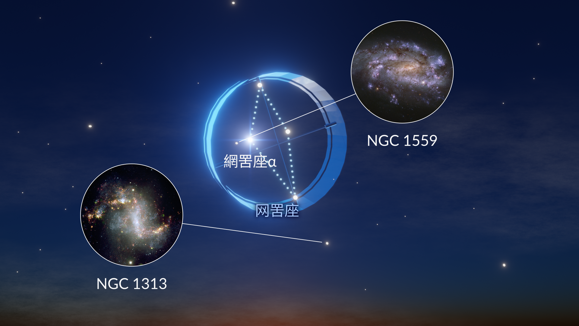 - 最亮深空天体:NGC1313(视星等10.0)、NGC1559(视星等10.5)
