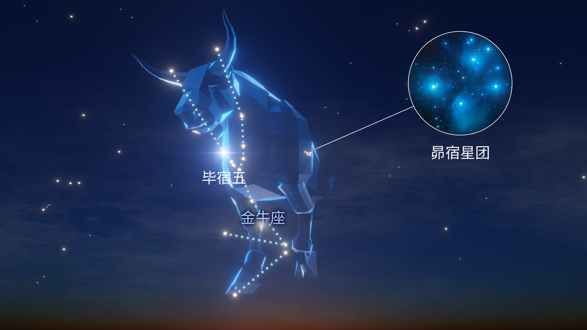 金牛座中的另一个重要星团是毕宿星团。毕宿五看起来位于该星团之中,但实际上并不属于它:毕宿五距离地球约65光年,而毕宿星团则位于153光年之外。在这个星座中,你还可以找到蟹状星云(M1),这是1054年被观测到的一次超新星爆发的遗迹。