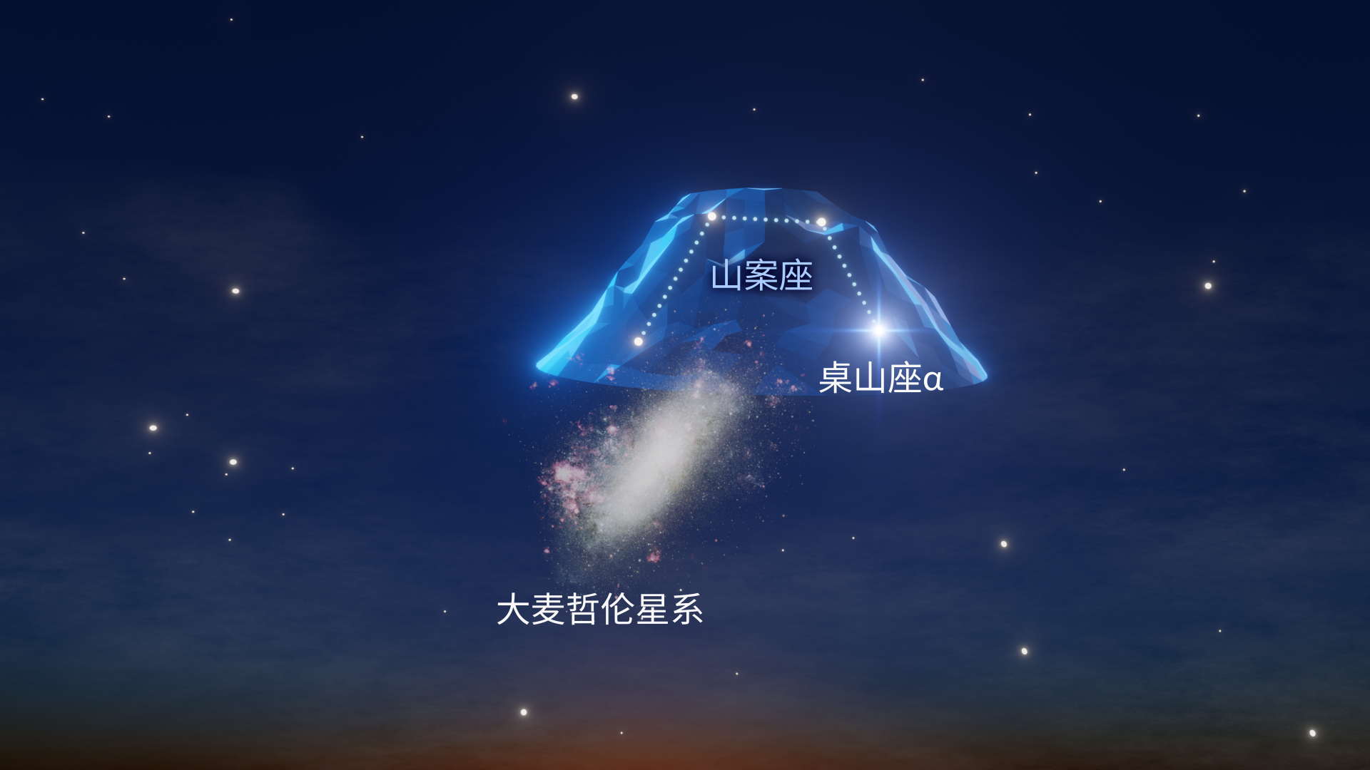 山案座包含了近一半的大麦哲伦云,但其余大多数深空天体——包括疏散星团和球状星团——都相当暗淡。剑鱼座位于山案座的北侧,因此如果你想挑战寻找山案座,最好先从剑鱼座入手。