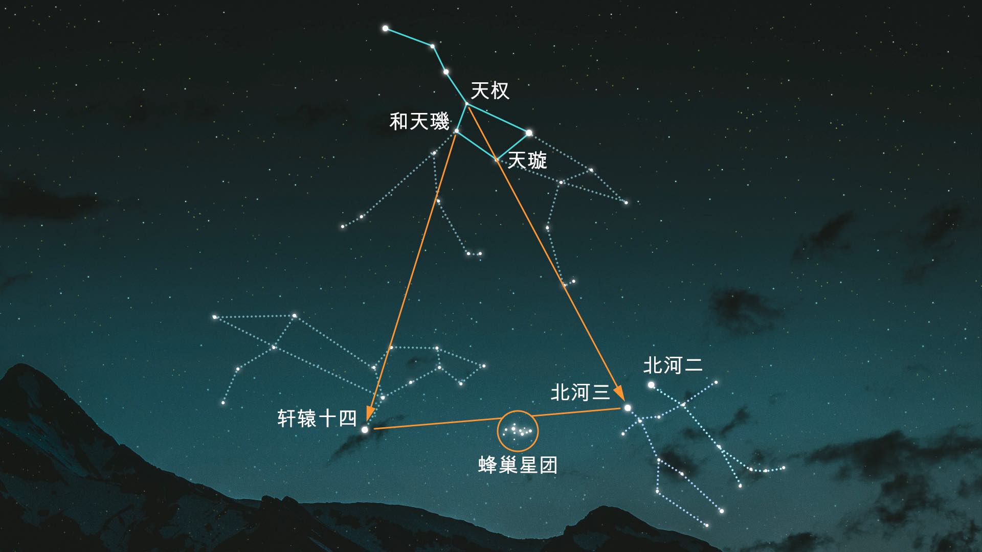 然后找到构成北斗七星“碗”内部的两颗星:天权和天璣。