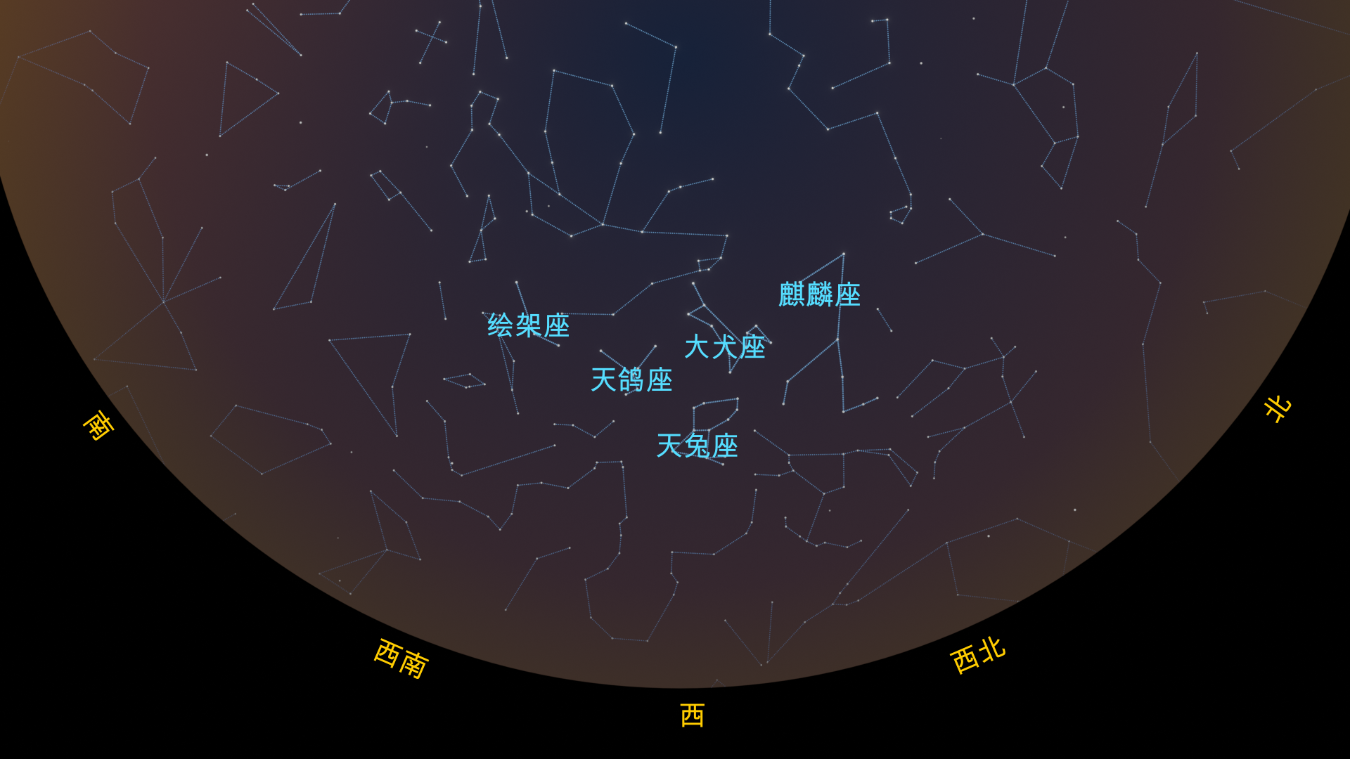 2月在南半球最适合观测的星座包括大犬座、天兔座、鸽子座、麒麟座和绘架座。
