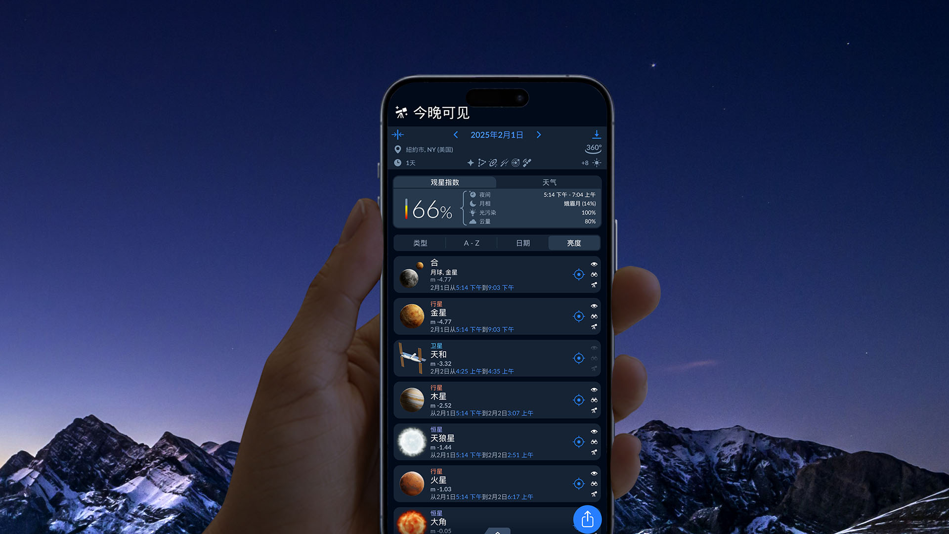 想知道2月的天象在你所在的位置是否可见吗?试试Sky Tonight应用吧!它会根据你的位置,实时显示行星、恒星、星座,甚至是深空天体的位置,同时还会列出即将发生的天象事件,并提供精确到你所在地的时间。不论你是在计划一次观星之夜,还是只是想看看今晚天空中有什么,Sky Tonight都能让探索夜空变得简单又有趣。快来试试,看看今晚会遇见什么吧!